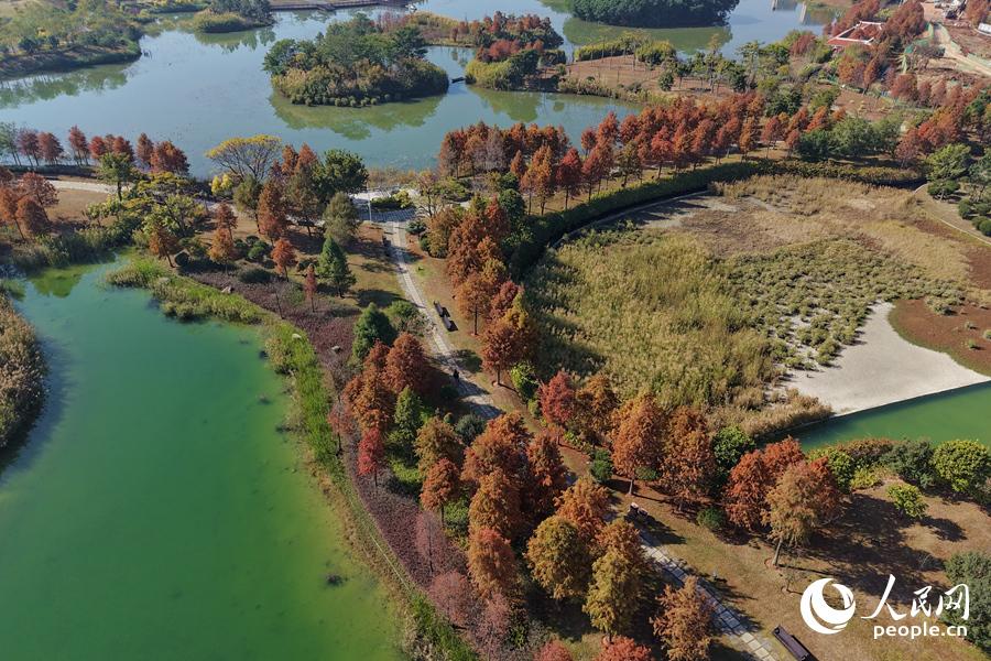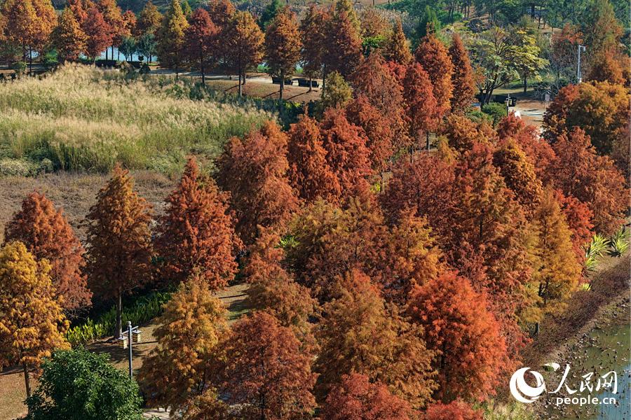 在厦门南湖公园中,落羽杉树冠呈现绿、黄、橙、红错落交织的景色。人民网记者 陈博摄