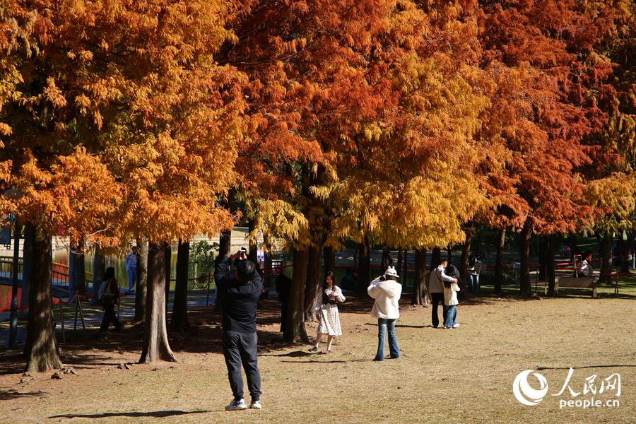 和煦暖阳下,落羽杉金红一片。人民网记者 陈博摄