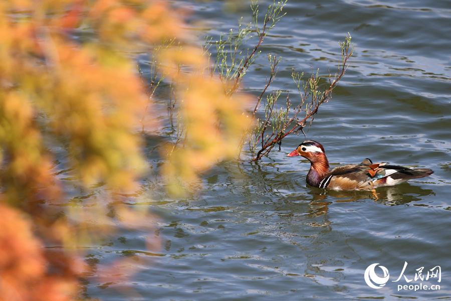 鸳鸯在落羽杉下觅食。人民网记者 陈博摄