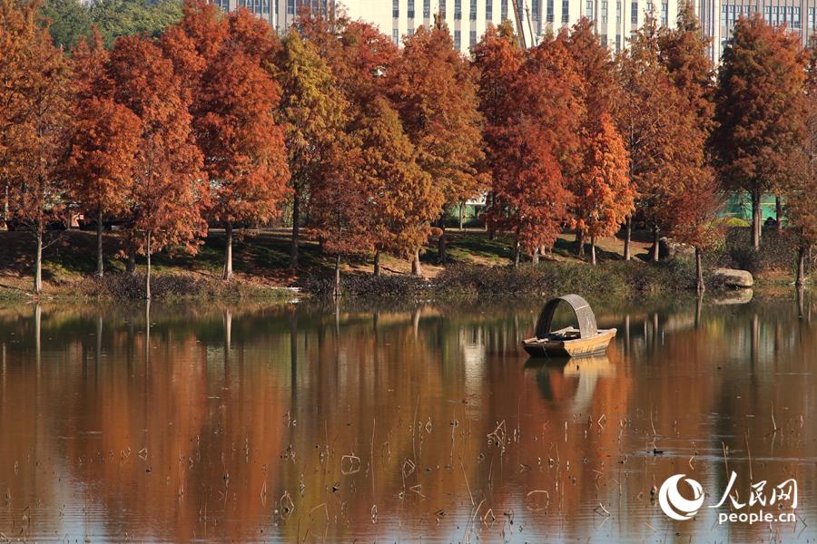 色彩斑斓的落羽杉与池水映波成画。人民网记者 陈博摄