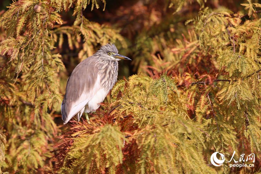 在位于厦门思明的东山水库,池鹭在落羽杉枝头停留。人民网记者 陈博摄