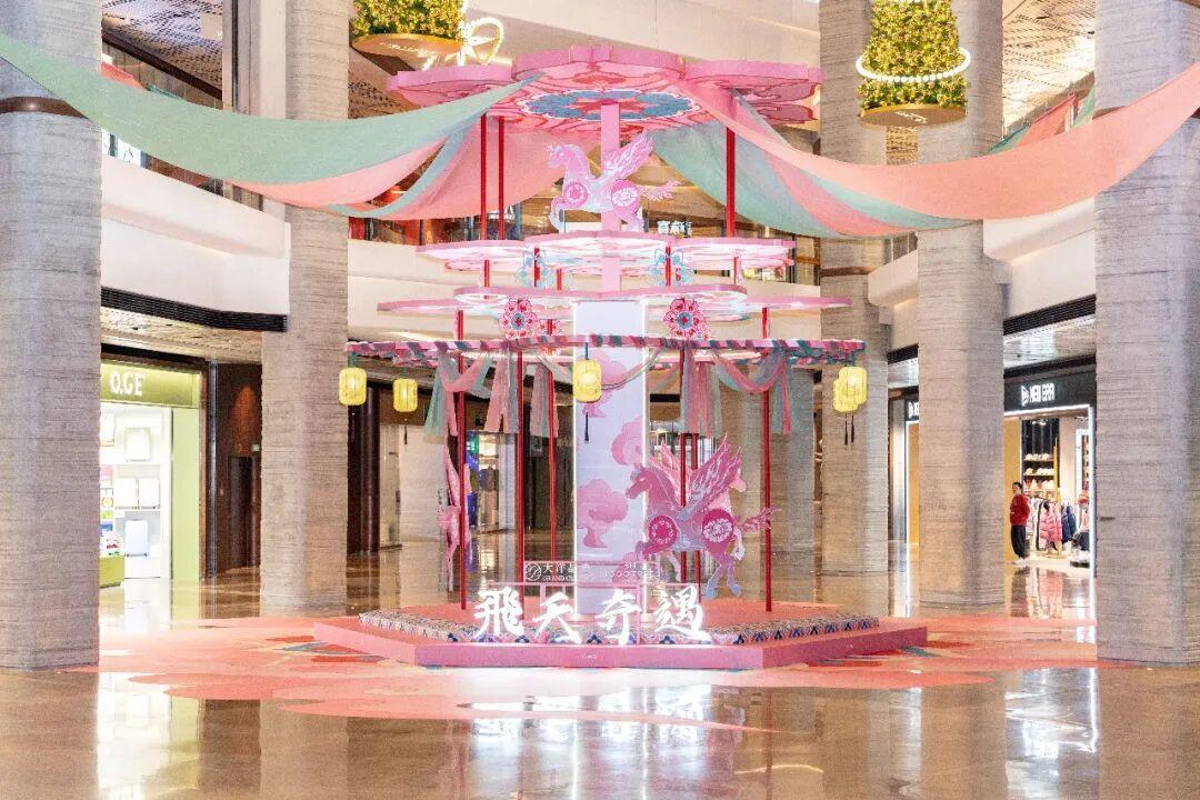 此次美陈融合了场景营造与敦煌文化的双重逻辑。设计团队从莫高窟艺术中提取层叠、延展的视觉语言,与天安千树建筑本身“向上生发”的形态特征形成呼应,通过莲花、飞天、藻井等符号的当代表达,构建连接传统美学与现代生活的公共艺术场景。