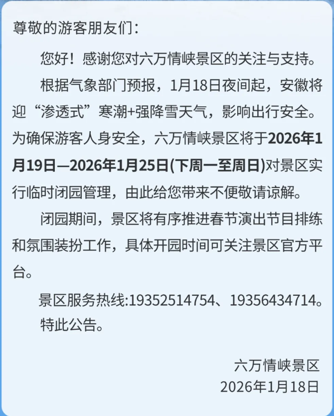 1月18日,霍山六万情峡景区发布临时闭园公告。因天气原因,六万情峡景区将于2026年1月19日至2026年1月25日对景区实行临时闭园管理。具体如下: