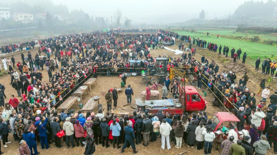 2026年1月15日,四川省资阳市安岳县通贤镇帽石村举办了一场充满乡土温情的免费刨汤宴活动,吸引了上万名来自各地的客人到村深度体验原汁原味的乡村生活。 杨康忠 摄(人民图片网)