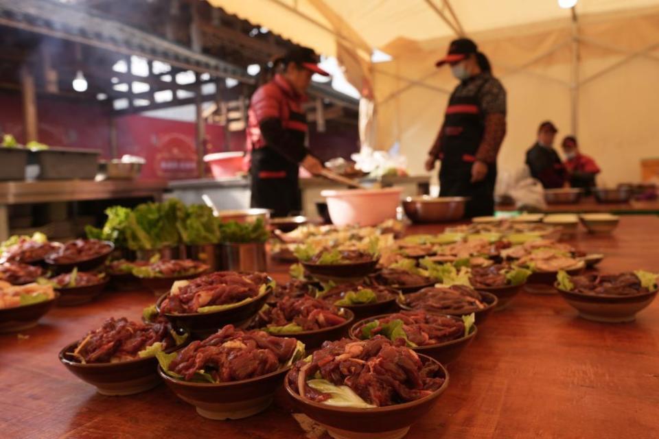 2026年1月15日,湖北恩施土家族苗族自治州咸丰县曲江镇湾田村村民为游客准备刨汤宴。李维君 摄(人民图片网)