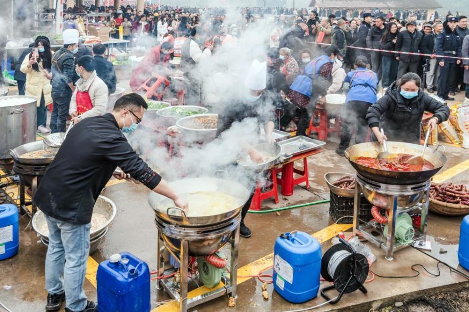 2026年1月11日,游客在重庆市黔江区武陵黑猪乡村文化节上参加武陵黑猪刨汤宴。杨敏 摄(人民图片网)