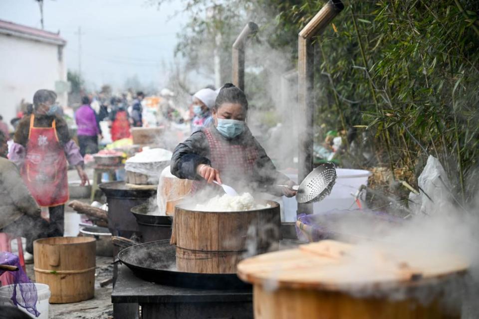 2026年1月17日,在贵州省黔南布依族苗族自治州龙里县湾滩河镇园区村,村民在烹饪区蒸米饭,为刨汤宴做准备。袁福洪 摄(人民图片网)