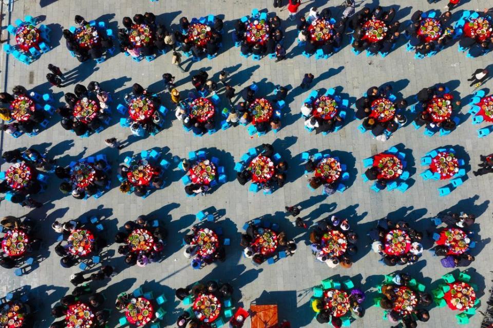 2026年1月10日,湖北省恩施土家族苗族自治州巴东县信陵镇土店子村人声鼎沸,村民与游客欢聚一堂,吃刨汤、话团圆。焦国斌 摄(人民图片网)