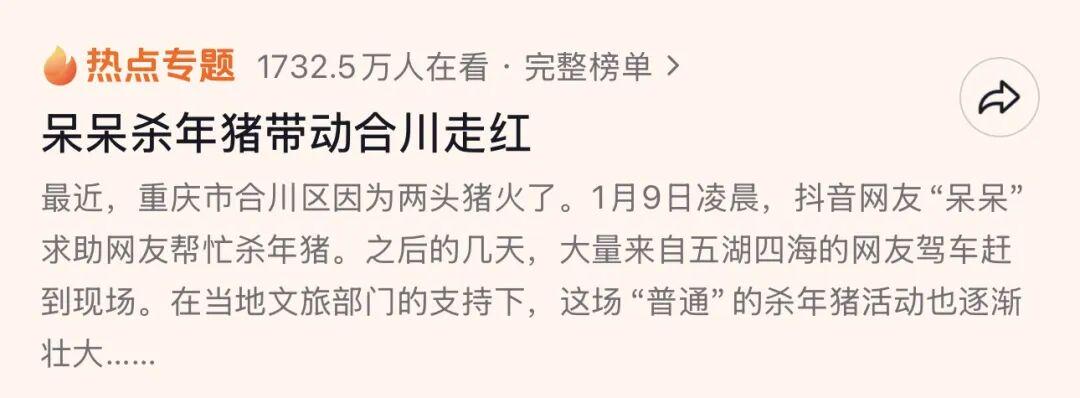 "家里杀年猪杀不完,求帮忙,管刨汤饭!"重庆合川一条朴素的求助视频,两天内引来上千人跨省奔赴,不仅人民日报第一时间报道,国台办都回应了相关新闻。而在此之前,上海甩出2570项春节文旅活动,把演唱会搬进春节档,福建则联动1500多场"闽式福年"活动+100条特色线路,连欧美网红都请来站台。