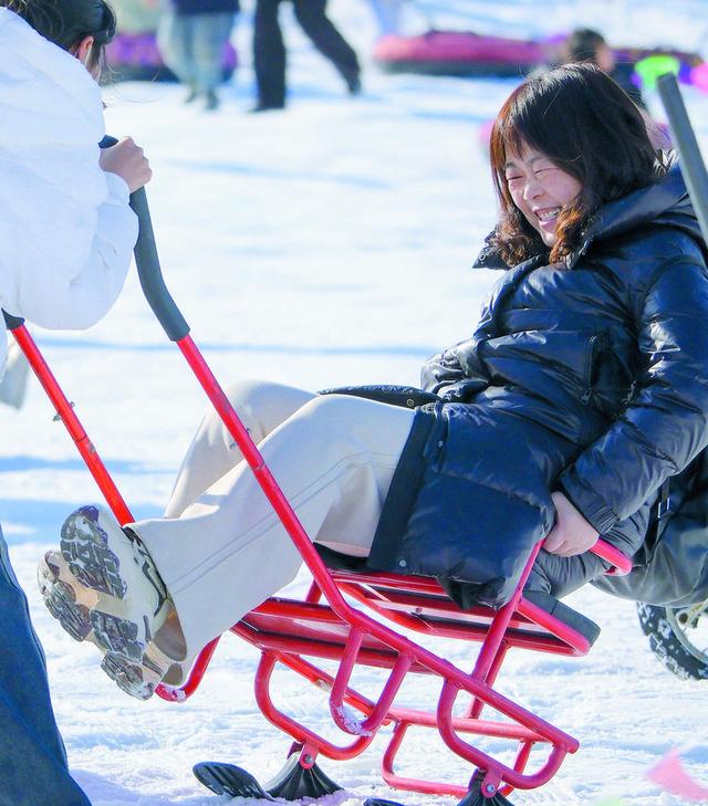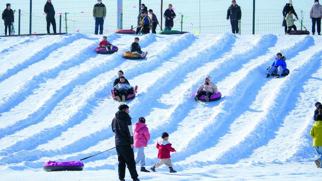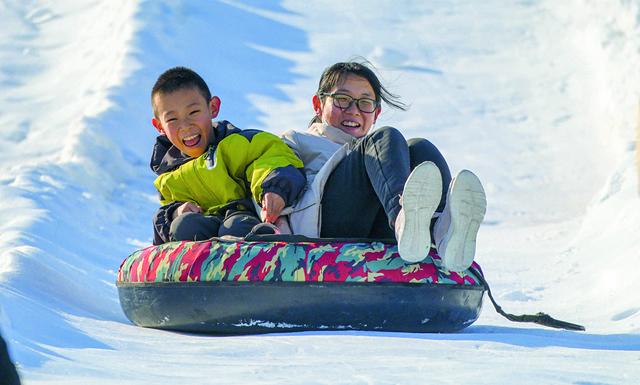 游客们带着孩子在槐河岸边的冰雪嘉年华体验冰雪项目。 (赞皇县委宣传部供图)