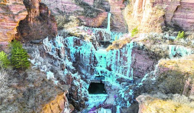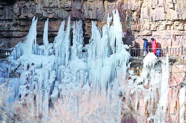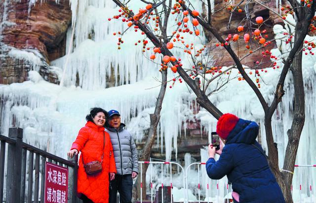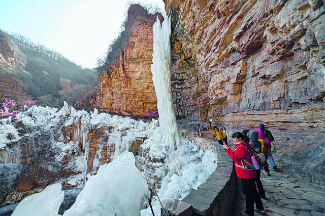 嶂石岩景区的冰瀑前,络绎不绝的游客拍下美好瞬间。