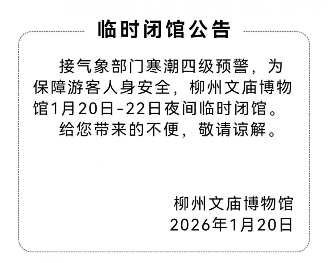 1月20日 ,柳州文庙博物馆发布临时闭馆公告。