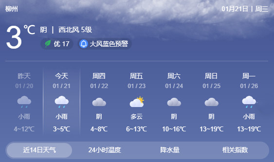 1月21日9时,柳州市气象台发布低温雨雪冰冻四级(蓝色)预警:预计未来24小时,三江、融水、融安三县的部分乡镇及高寒山区有雨夹雪、冰冻、冻雨和道路结冰。最低气温:高寒山区-9~-1℃,北部-1~1℃,南部1~3℃。请广大民众注意防范。