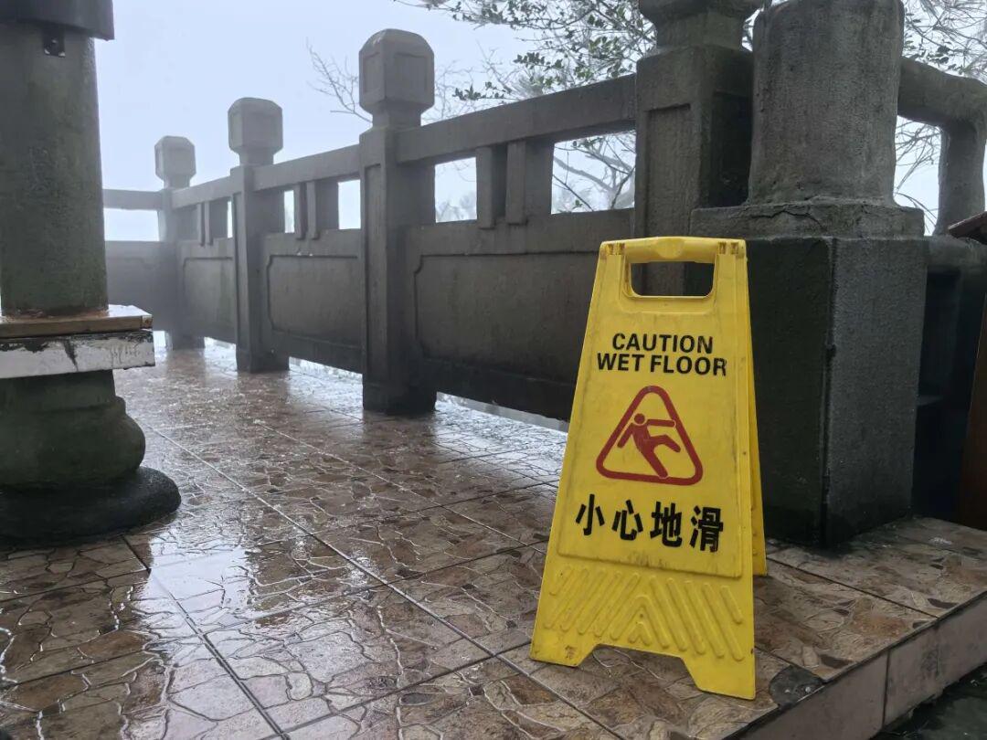 工作人员已经放置“小心地滑”等安全提醒