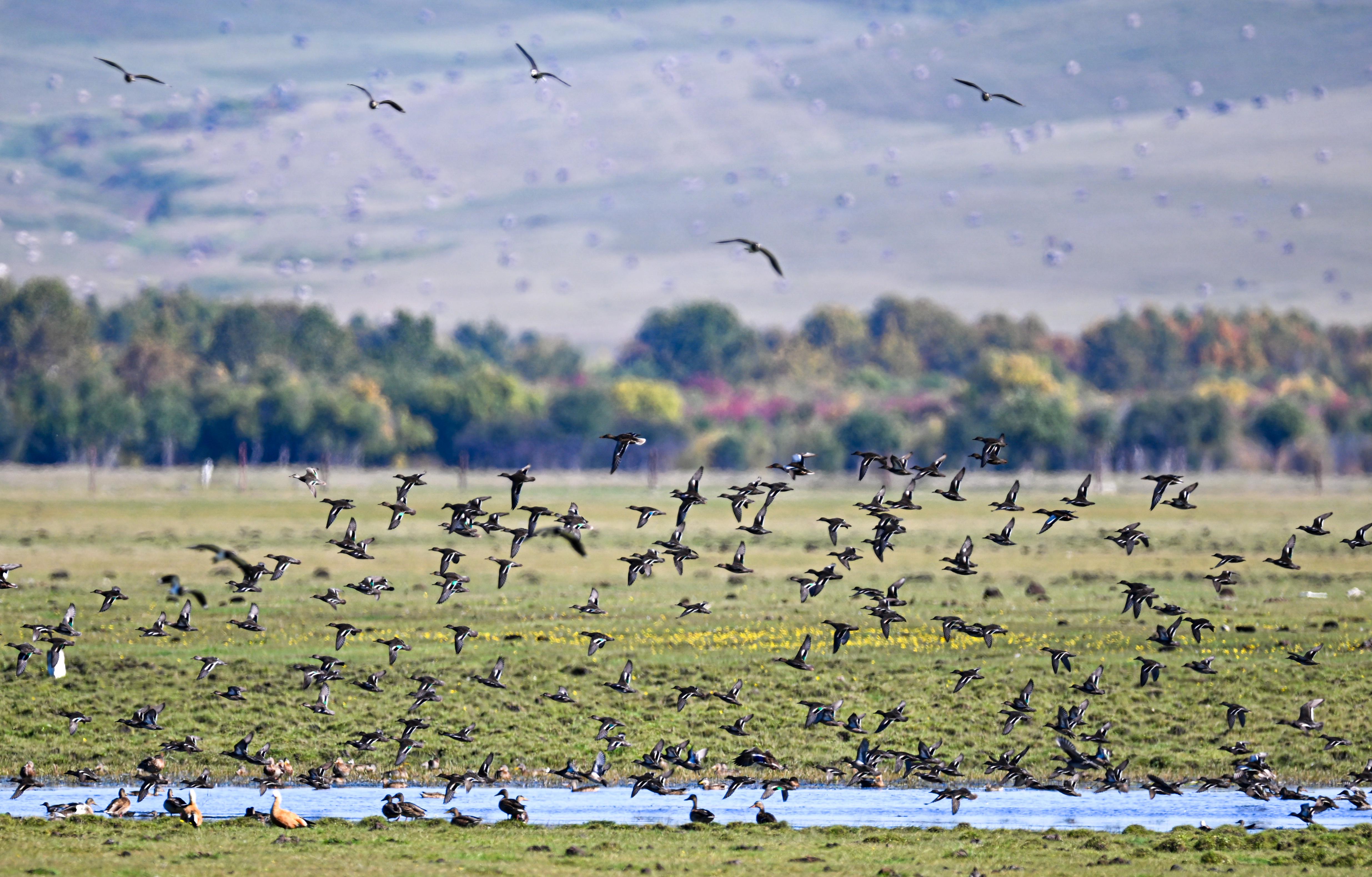 水孕育了生机。在额尔古纳湿地,我遇到了湿地管理局的“95后”巡护员宝金财。他的望远镜里,世界是由灰鹤的优雅、金雕的凌厉和无数赤麻鸭翅膀划过的弧线构成的。他说,他们的工作就是当好“生态管家”,用脚步走遍湿地,用红外相机守护生灵。“我像保护我的家人一样保护湿地鸟儿。”宝金财这样告诉我。