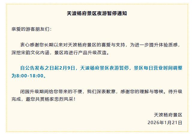 记者从天波杨府景区获悉,为进一步提升体验质感,深挖宋韵文化内涵,景区将进行产品升级改造。即日起2月9日,天波杨府景区夜游暂停,景区每日营业时间调整为8:00-18:00。