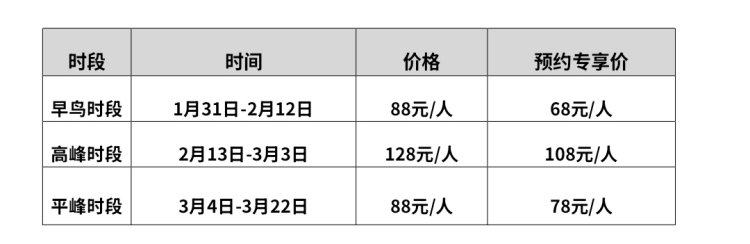 ①早鸟票:1月23日—2月12日,可通过直播间提前购票,享受对应时段专属优惠;