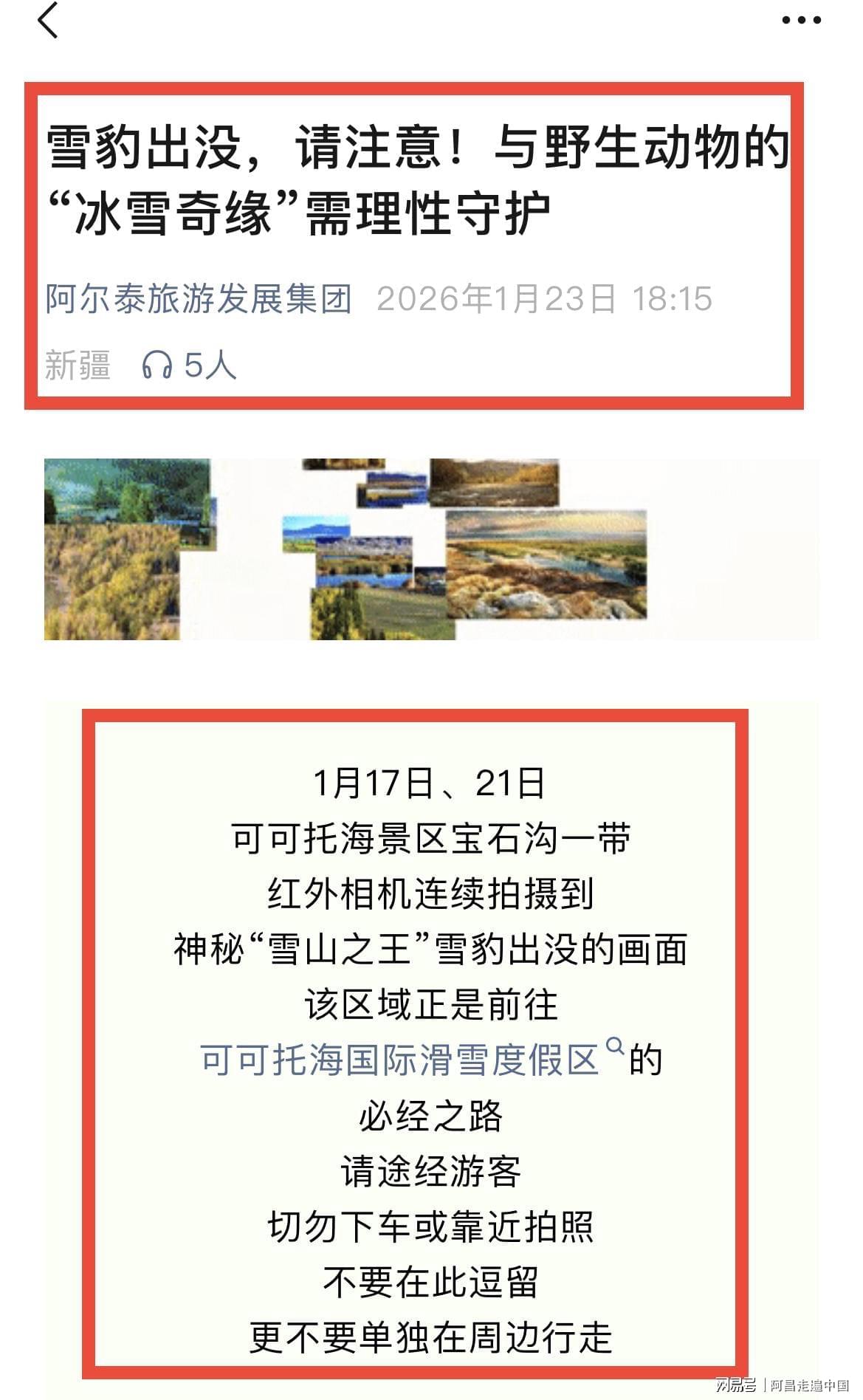 2026年1月23日,阿勒泰旅游官方账号发文,近期拍到雪豹出没,提醒滑雪游客大家注意安全: