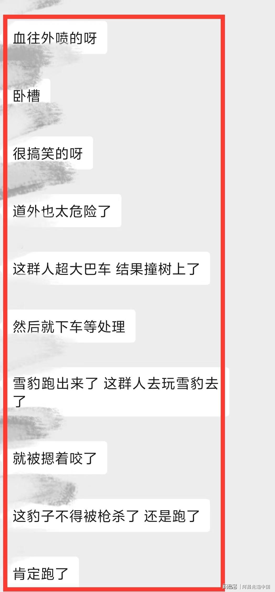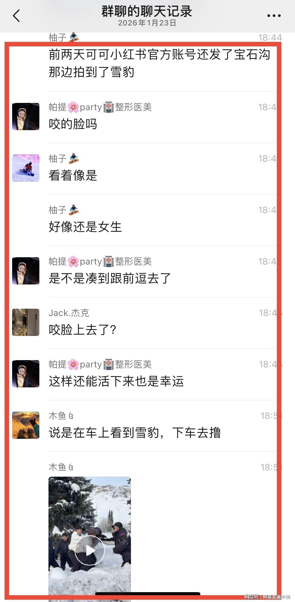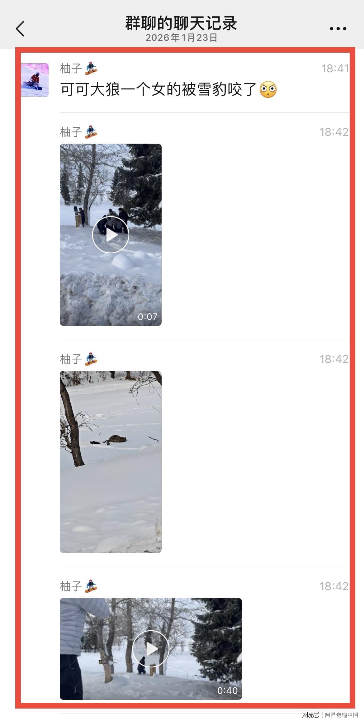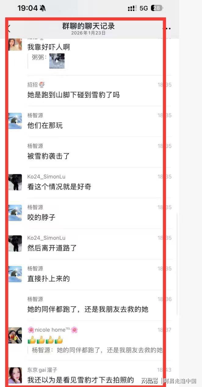 然而可怕事情还是发生了,2026年1月23日一组聊天截图,在各大微信群和短视频流传,阿勒泰可可托海宝石沟附近有滑雪游客被雪豹咬伤,从视频来看,该游客是一名女性,面部被雪豹咬伤,头上戴着滑雪帽子,身穿滑雪服,视频里很多人把女游客扶起来往外走,现场有人说赶快打120救援,也有人喊雪豹已经走了,赶快扶着女游客在事发地离开。