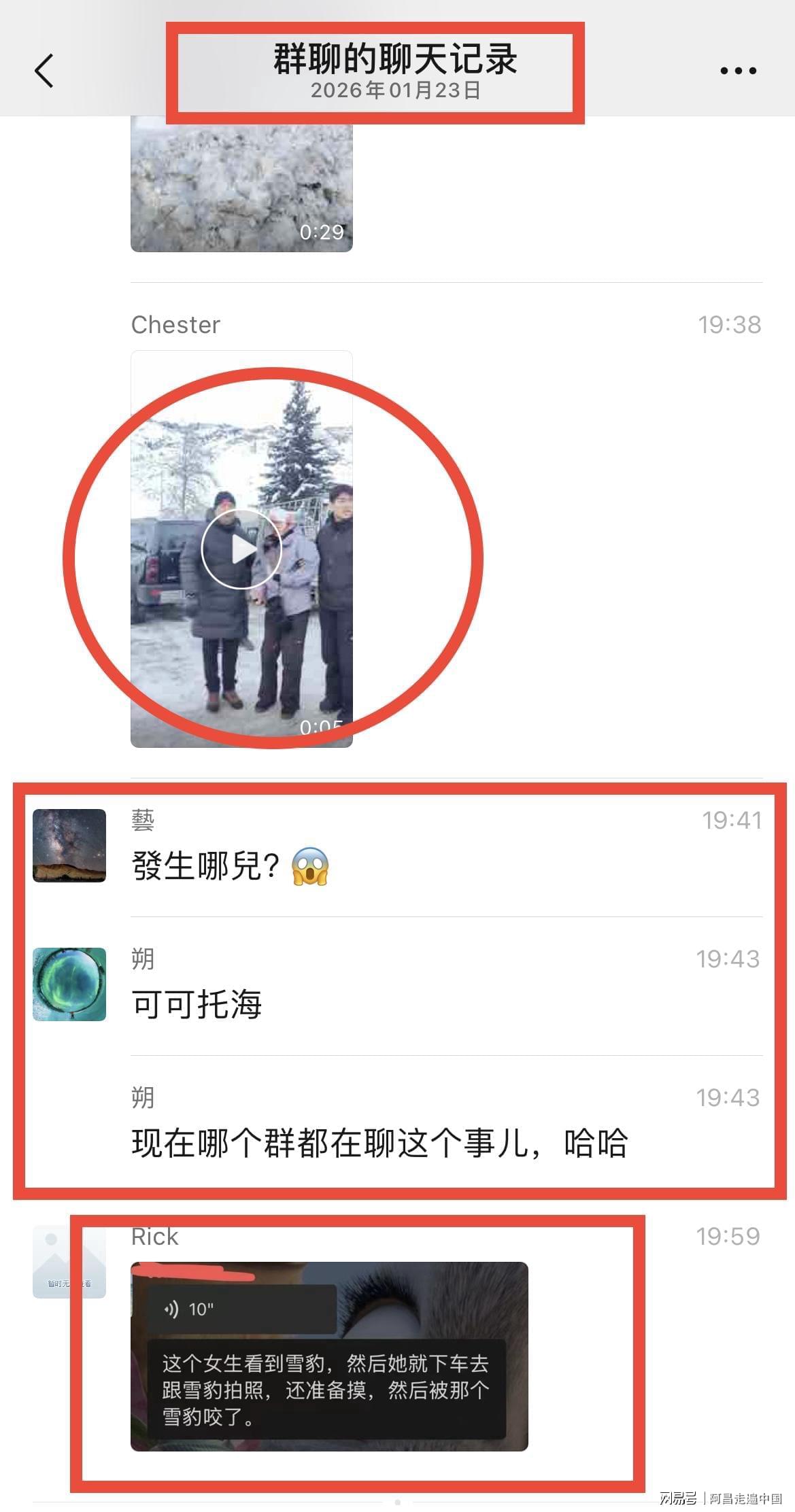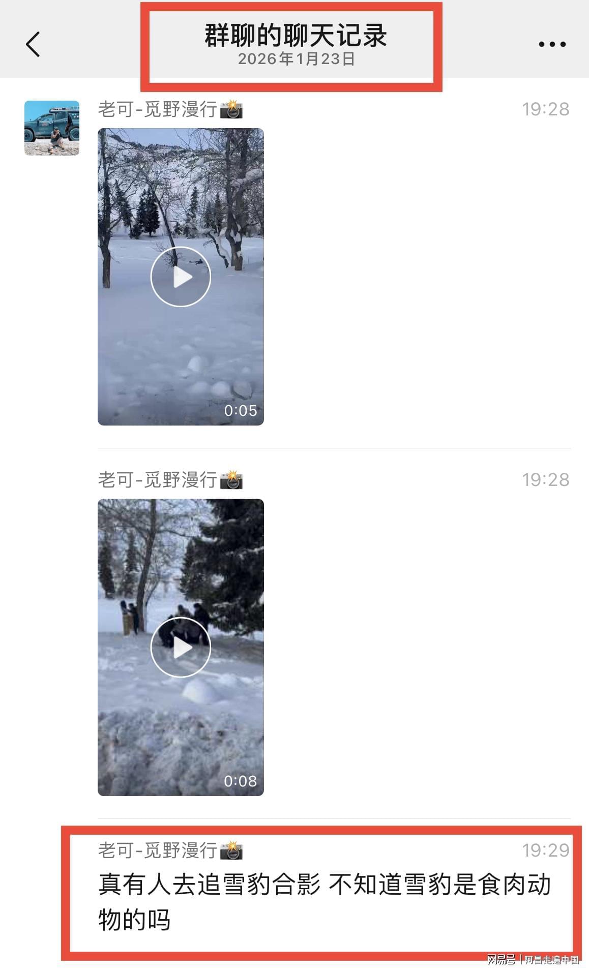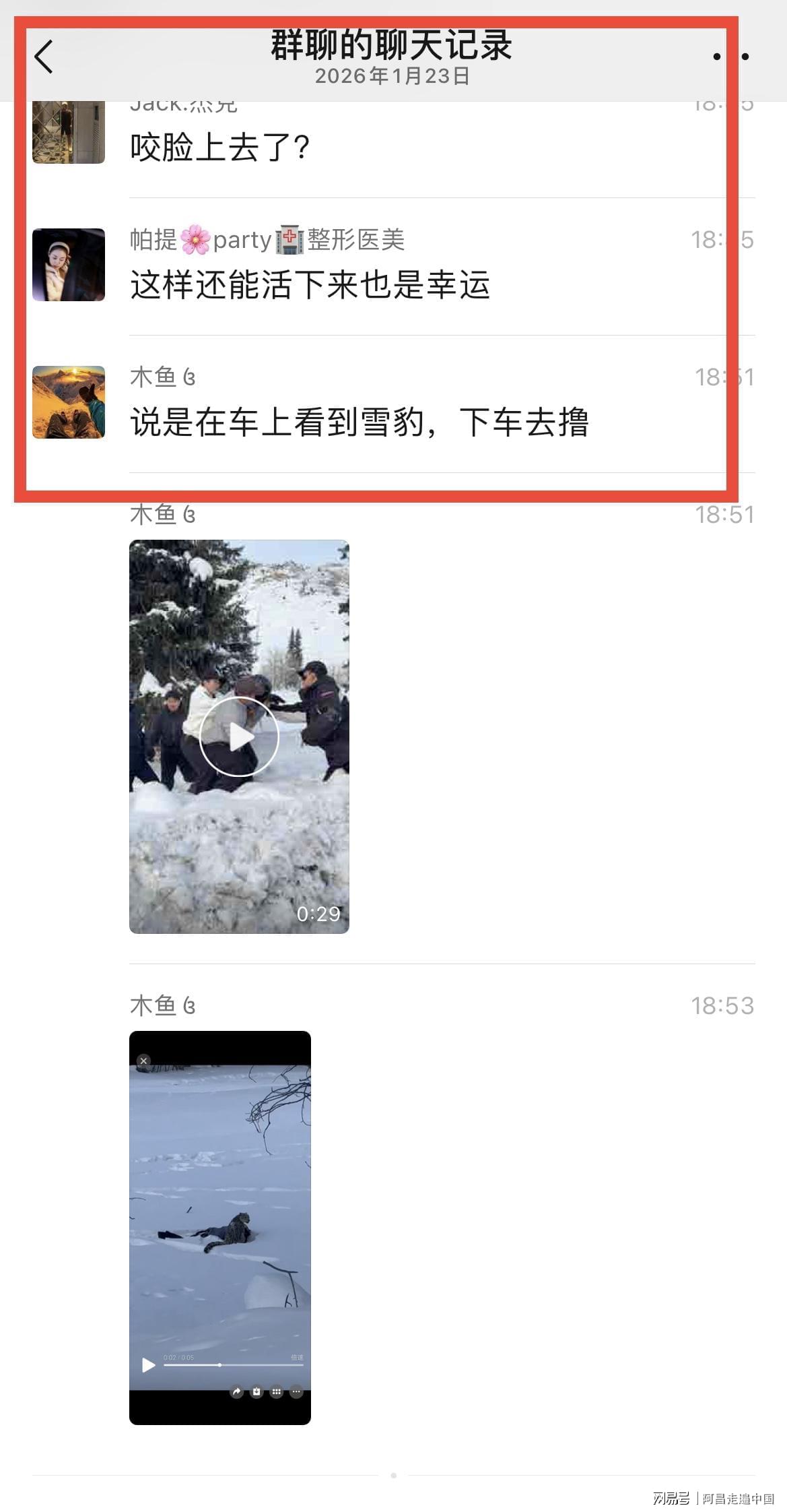 然而可怕事情还是发生了,2026年1月23日一组聊天截图,在各大微信群和短视频流传,阿勒泰可可托海宝石沟附近有滑雪游客被雪豹咬伤,从视频来看,该游客是一名女性,面部被雪豹咬伤,头上戴着滑雪帽子,身穿滑雪服,视频里很多人把女游客扶起来往外走,现场有人说赶快打120救援,也有人喊雪豹已经走了,赶快扶着女游客在事发地离开。