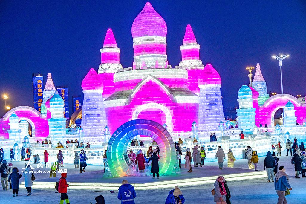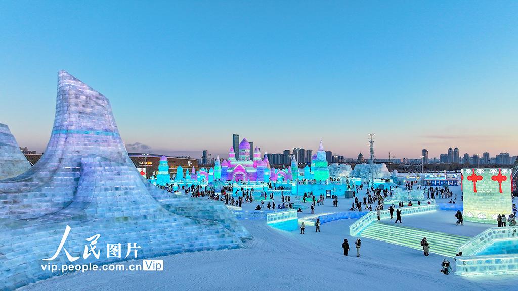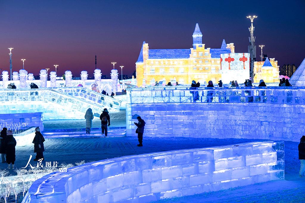 据悉,该园区占地面积达120万平方米,总用冰用雪量突破40万立方米,规模创历届之最。哈尔滨冰雪大世界始创于1999年,是全球规模最大的冰雪主题乐园之一。何华文摄(人民图片网)