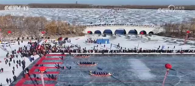 在嫩江湾的冰面上,鼓声雷动、号子震天,32支冰上龙舟队正挥钎竞渡,冰屑飞溅间,选手们的呐喊声与观众的欢呼声交织在一起,点燃了冬日的寒冷。赛场周边,冰雪嘉年华同步开启,抽冰猴的清脆声响不绝于耳,八爪鱼橡胶船、冰上碰碰球等新潮项目让游客玩得不亦乐乎。