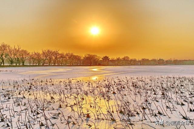 几只水鸟展开翅膀从湖面掠过,翅膀划破晨雾的瞬间,给这片素白天地添了几分灵动。它们低空盘旋,掠过残荷的枝干,黑色的荷梗从雪层中探出,枝丫上挂着的雪团如缀玉珠,与水面倒影交织,构成一幅疏密有致的天然水墨画。