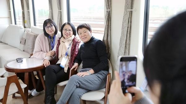 旅客在“桂行天下”旅游专列多功能厅拍照。林高摄