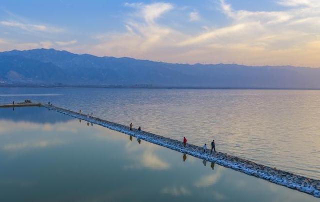 冬日晴空下,游客在七彩盐湖景区漫步,仿佛置身于“天空之镜”,亲身感受着生态之变带来的独特魅力。