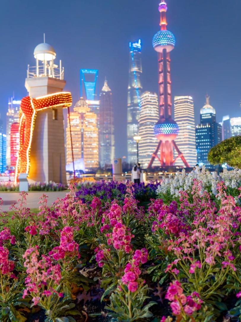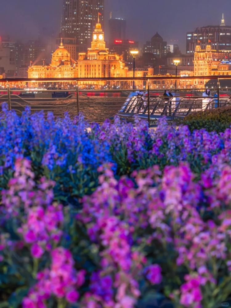 傍晚六点,灯光亮起,蓝色时刻降临。花海与天际线同框、低角度透过花隙拍摄江轮、与“金属蛋”及滨江艺术装置合影……每一个角落都透着静谧的诗意。