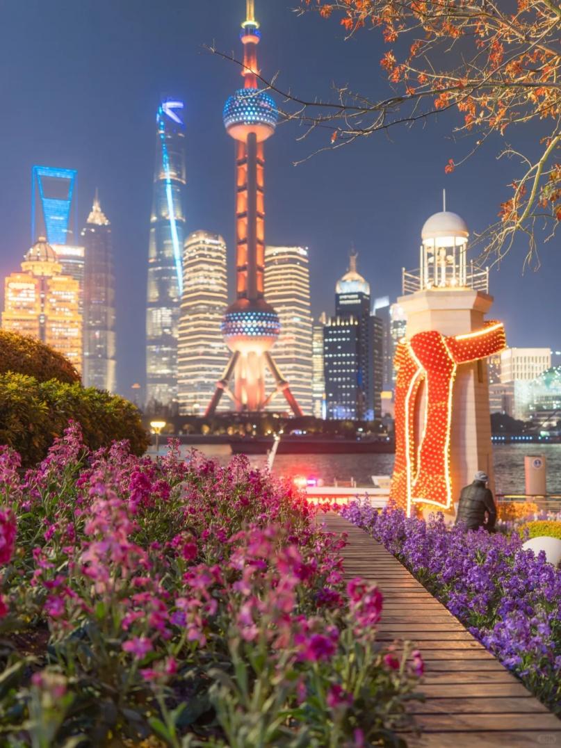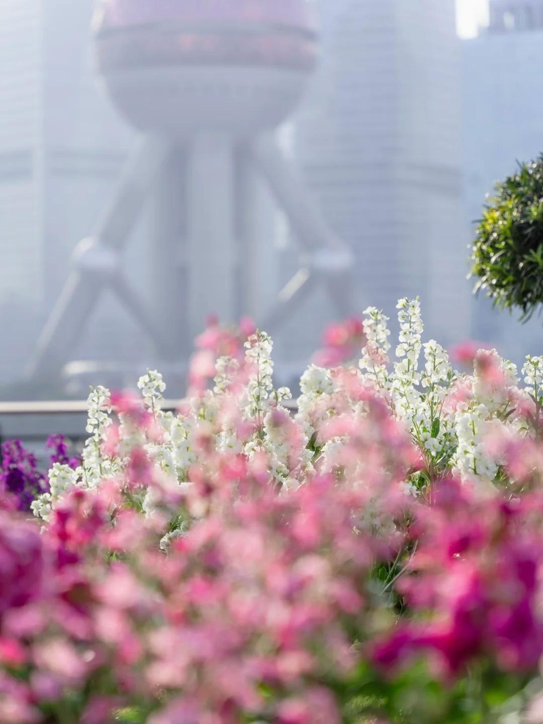 在海事塔前的花海,低机位可以把花海和陆家嘴同框,点缀行人氛围感超绝。