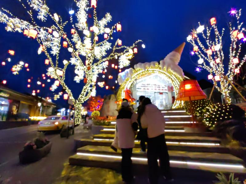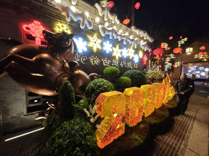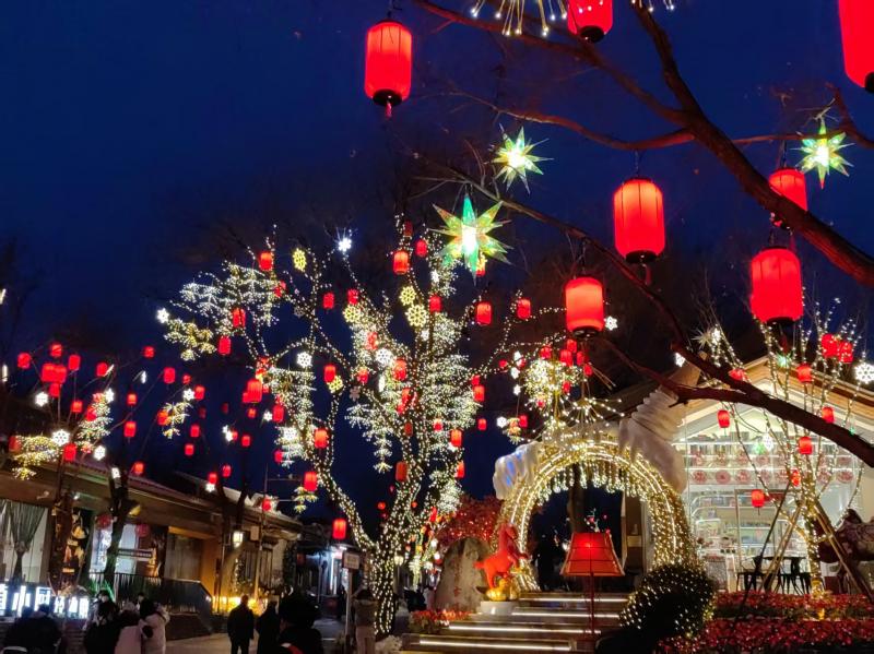北京青报记者看到,以老北京雪景为基调,街区乔木上缀满橙红灯笼、烟花灯与雪花灯,十二组特色灯景沿模式口大街和北街次第铺展:"瑞马迎春"灯组昂首腾跃,传递蓬勃朝气;"摩登雪夜"以现代灯光技术营造浪漫意境;"马上大桔"巧用谐音,送上"大吉大利"的新春祝福。此外,从模式口大街远眺翠微山的灯光长廊,将山城视觉轴线、古道文化底蕴与生肖寓意巧妙串联,为市民游客献上一场沉浸式新春光影盛宴。