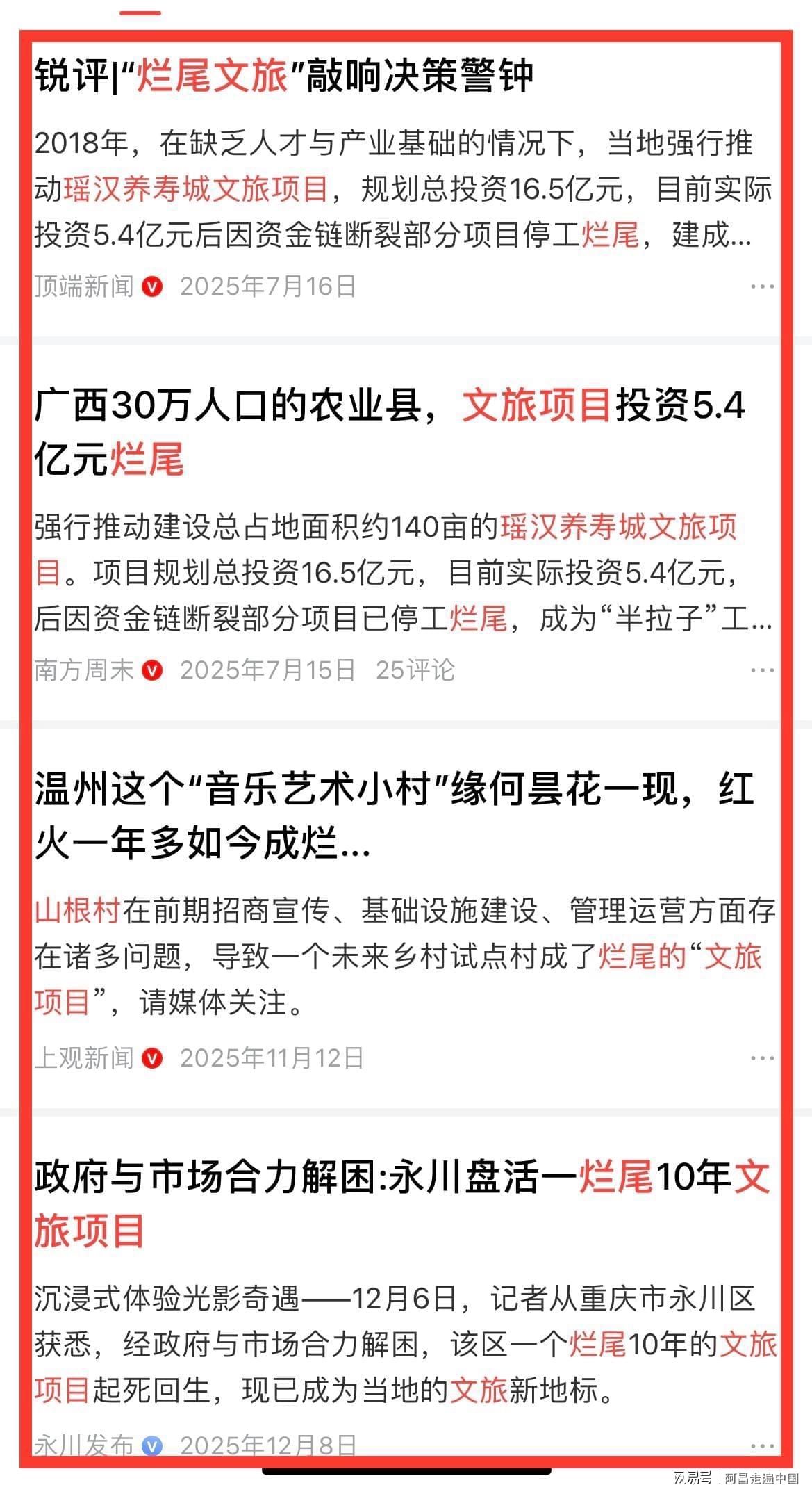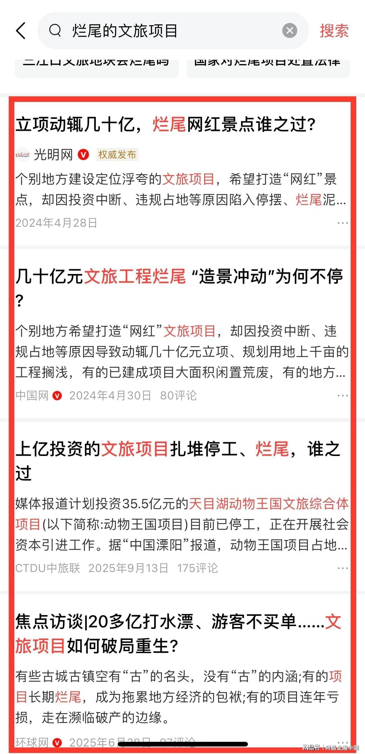这几年很多文旅项目修得起,养不起,最后都烂尾了,举几个例子如下:湖南大庸古城、贵州独山县的水司楼连片烂尾文旅项目、广西桂林恭城“瑶汉养寿城”文旅项目、江苏溧阳市(天目湖动物王国文旅项目)都是前期拍脑袋后面入不敷出前车之鉴。