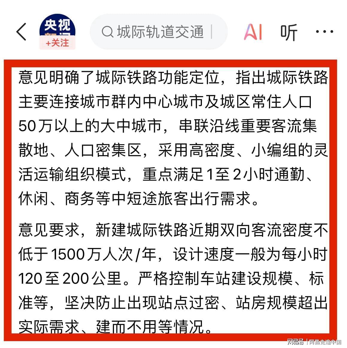 意见要求,新建城际铁路近期双向客流密度不低于1500万人次/年,设计速度一般为每小时120至200公里。严格控制车站建设规模、标准等,坚决防止出现站点过密、站房规模超出实际需求、建而不用等情況。
