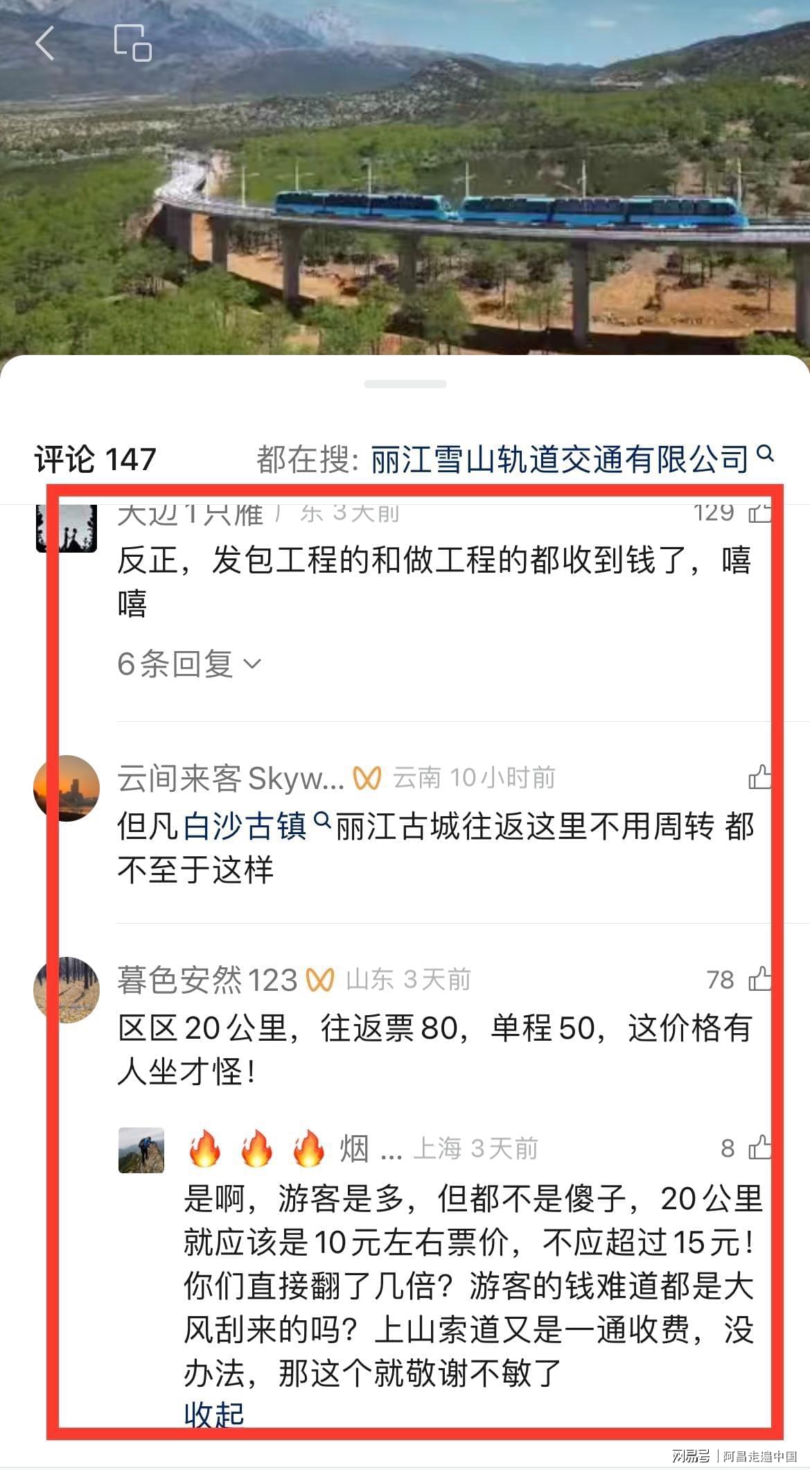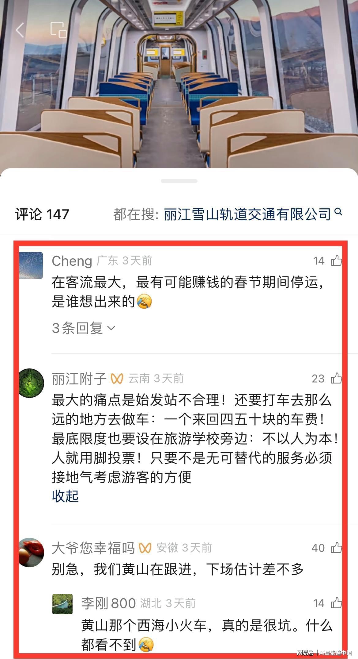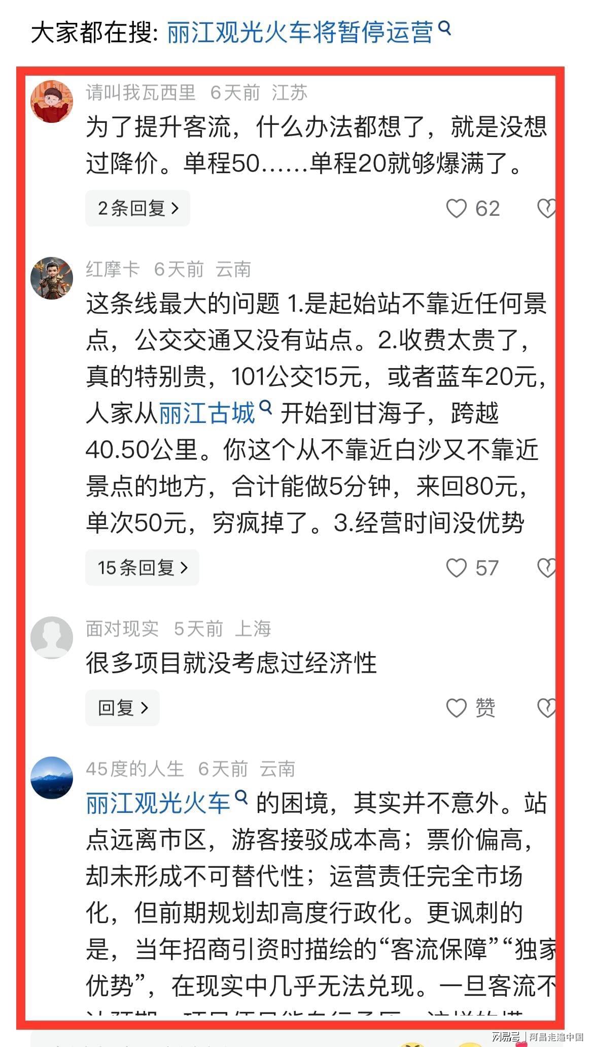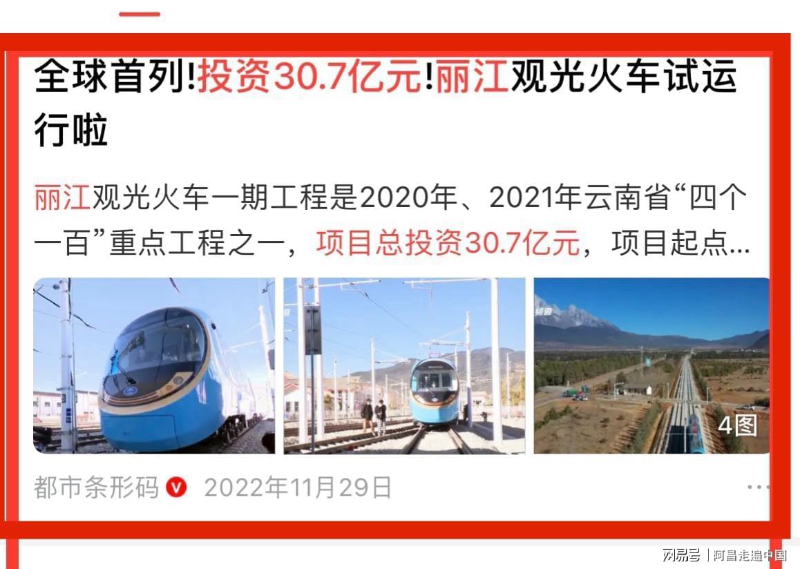 劳民伤财的文旅基建,号称全球第一观光小火车,当年在开工建设新闻是这样写的,全球最先进观光火车,连瑞士都没法比,我看了网上游客分享图片沿途20公里景色一般,1米9高观光玻璃门,没啥用,说实话,这个观光小火车票价单程50元,往返80元,如果拿建水小火车比起来,这个价格真不贵,建水小火车硬座往返120元,软座往返150元,建水小火车一直受游客青睐,建水小火车主要优点是他是百年米轨,沿途有国家重点文物保护单位双龙桥、相会桥古村落、终点站是著名古村落(团山村)历史意义厚重,丽江纯属于花费巨资打造一个运输游客快速区间车,投资时候评估是预计年接待游客164万人次,实际运营一年接待游客才9万人,并且说有一个汽车、公交站点距离上车点1公里,严重影响了游客选择,周边公交车又多,票价又便宜,游客自然选择打车或者坐公交车了,新闻周刊在回复网友一条评论说,丽江观光车主要原因不是缺游客,而是距离市区较远,路线太偏。