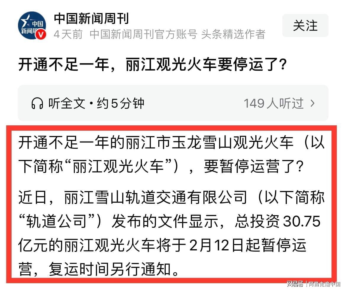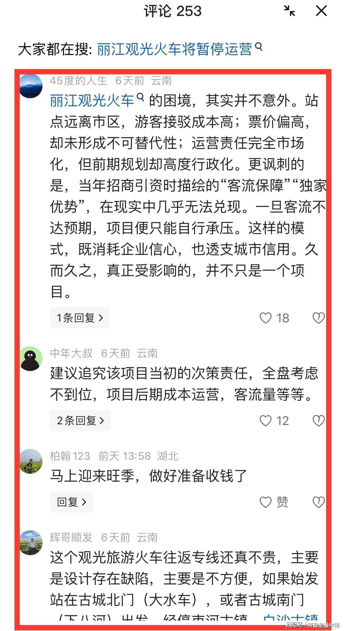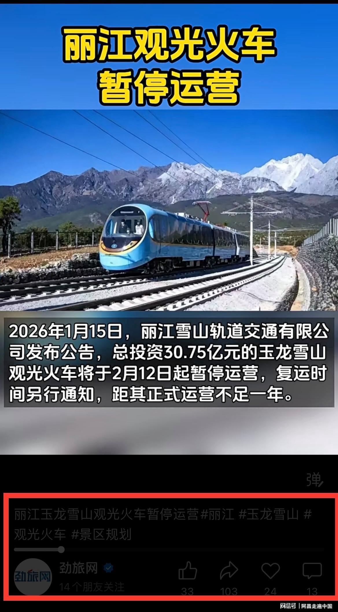 2026年1月22日《中国新闻周刊》发文,丽江开通运营一年的观光小火车于2026年2月12日停运,恢复运行另行通知,在网络上引起轩然大波,这种文旅项目与当初招标预算接待游客量与现实实际运营收入相差甚远,这样投资容易,运营难,该如何能扭转乾坤,变成盈利项目。