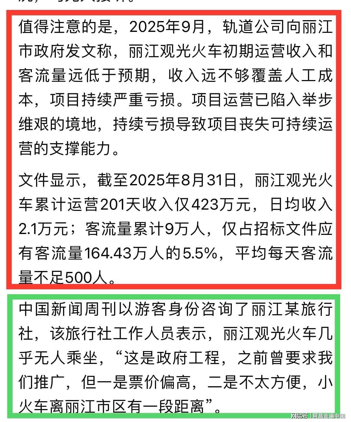 但是这条观光小火车路线,运营一年终于见分晓,2025年9月,丽江观光小火车运营公司就向丽江官方提供了一份实际运营收入报表:截至2025年8月31日,观光火车共计运营201天,运营收入累计423万元,仅占招标文件应取得票务收入12065万元的3.5%,平均每天收入仅2.1万元,还不够运营成本,而客流量累计约9万人,仅占招标文件应有客流量164.43万人的5.5%,平均每天客流量只有448人。