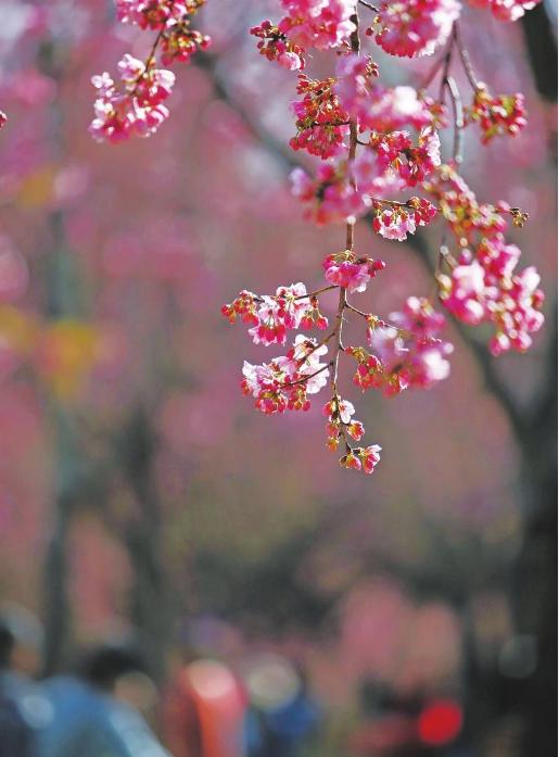 如今,圆通山栽种了云南樱花、垂丝海棠共2000余株,2月底至3月下旬两花齐放。一个月的花期里,从初绽的娇羞,到盛放的热烈,再到落英的诗意,演绎着春日最完整的烂漫。从东门进入园区,海棠大道的粉白花海率先铺展开来,细长的花梗上垂着玲珑花朵,微风过处,花瓣轻颤如蝶翼翻飞;前行至樱花区,浓烈的“樱花粉”与澄澈的“昆明蓝”相映成趣。登高远眺,200余米长的粉色花廊绵延起伏,构成春城花事美如画的图景。