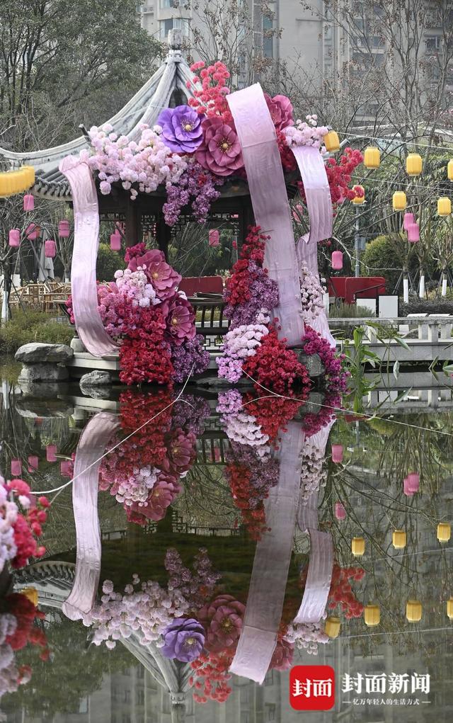 成都铁像寺水街小游园的亭子用花儿装扮一番。