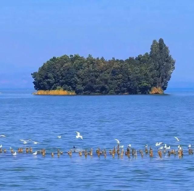 当天气晴朗时,滇池水面映出了一种来自天空的蓝色,滇池仿佛变身成为“蓝色大海”,配上童话般的小岛,画面确实很美。