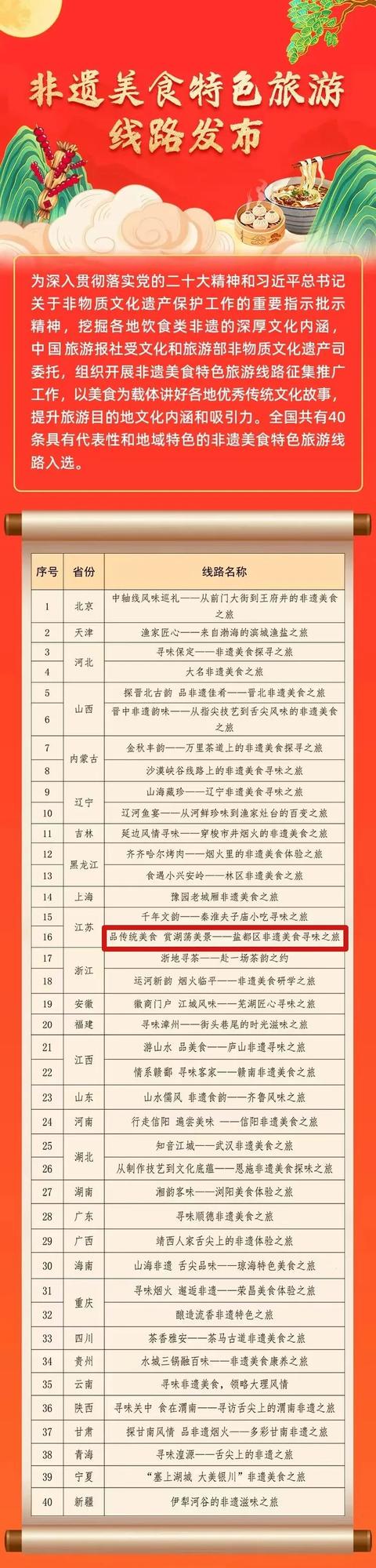 现代快报讯(记者 王菲)1月27日,2026年“非遗贺新春·寻味中国年”主题推广暨非遗年货购物月系列活动之“非遗融入现代生活”主题对话在广州举行。活动中,中国旅游报社发布40条非遗美食特色旅游线路,盐城市推出的“品传统美食 赏湖荡美景——盐都区非遗美食寻味之旅”线路成功入选。