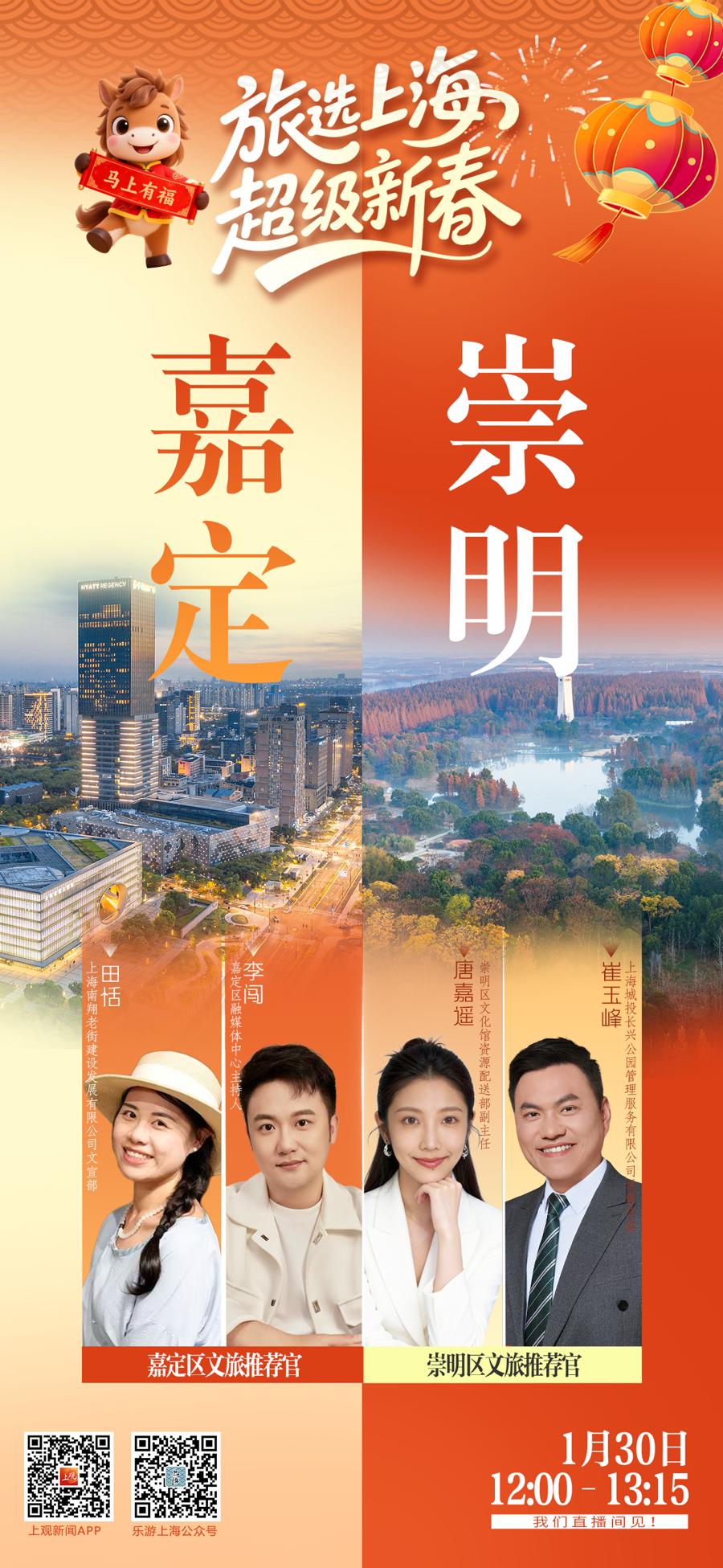 1月30日中午12点,“旅选上海,超级新春”文旅大直播迎来第二期。嘉定、崇明的文旅推荐官将作客上观新闻直播间,带来精心策划的线路与多重福利,助你规划新春假期。直播将通过上观新闻及“乐游上海”、各区融媒体平台同步播出,多重好礼将在直播过程中轮番放送。