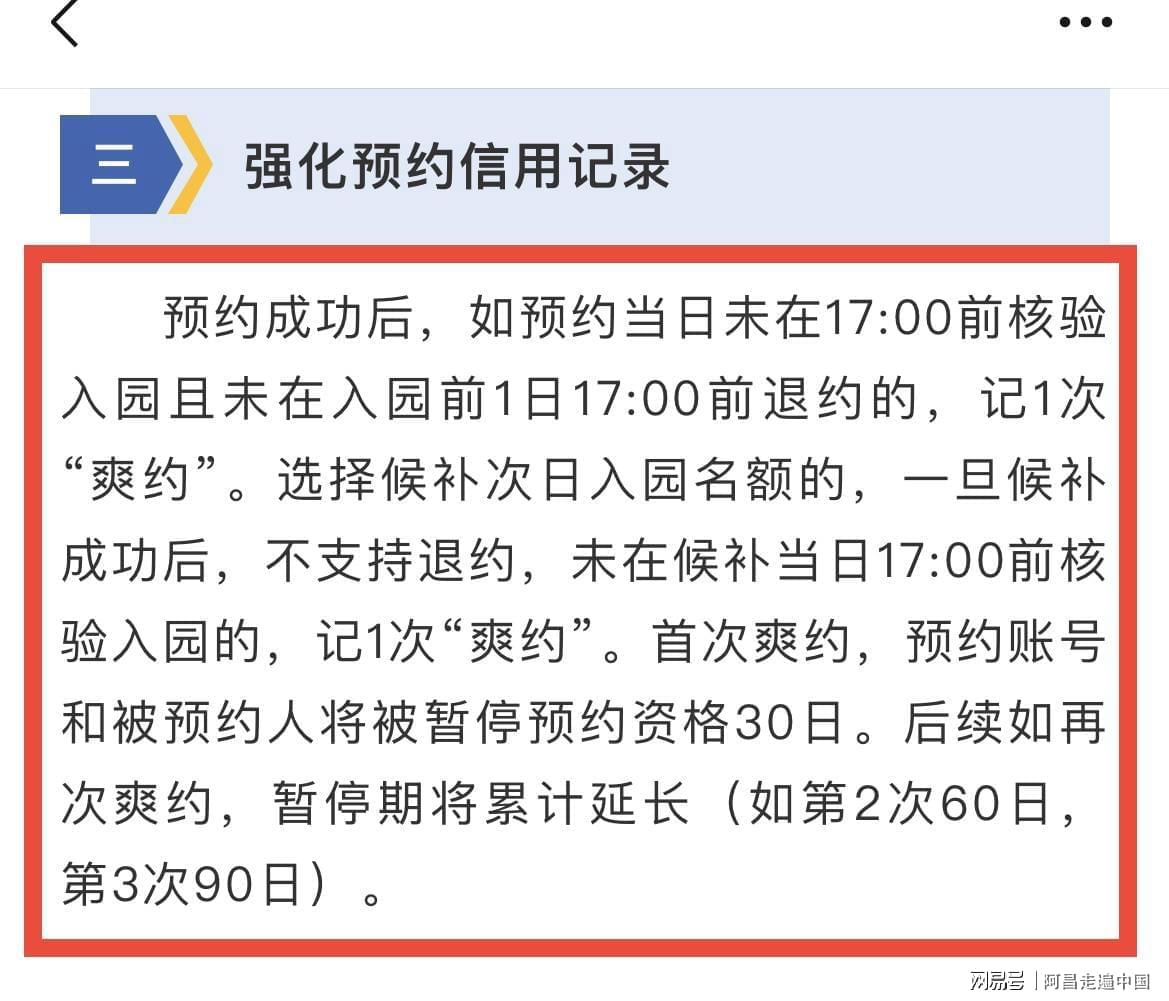 1.预约成功后,如预约当日未在17:00前核验入园且未在入园前1日17:00前退约的,记1次“爽约”。选择候补次日入园名额的,一旦候补成功后,不支持退约,未在候补当日17:00前核验入园的,记1次“爽约”。