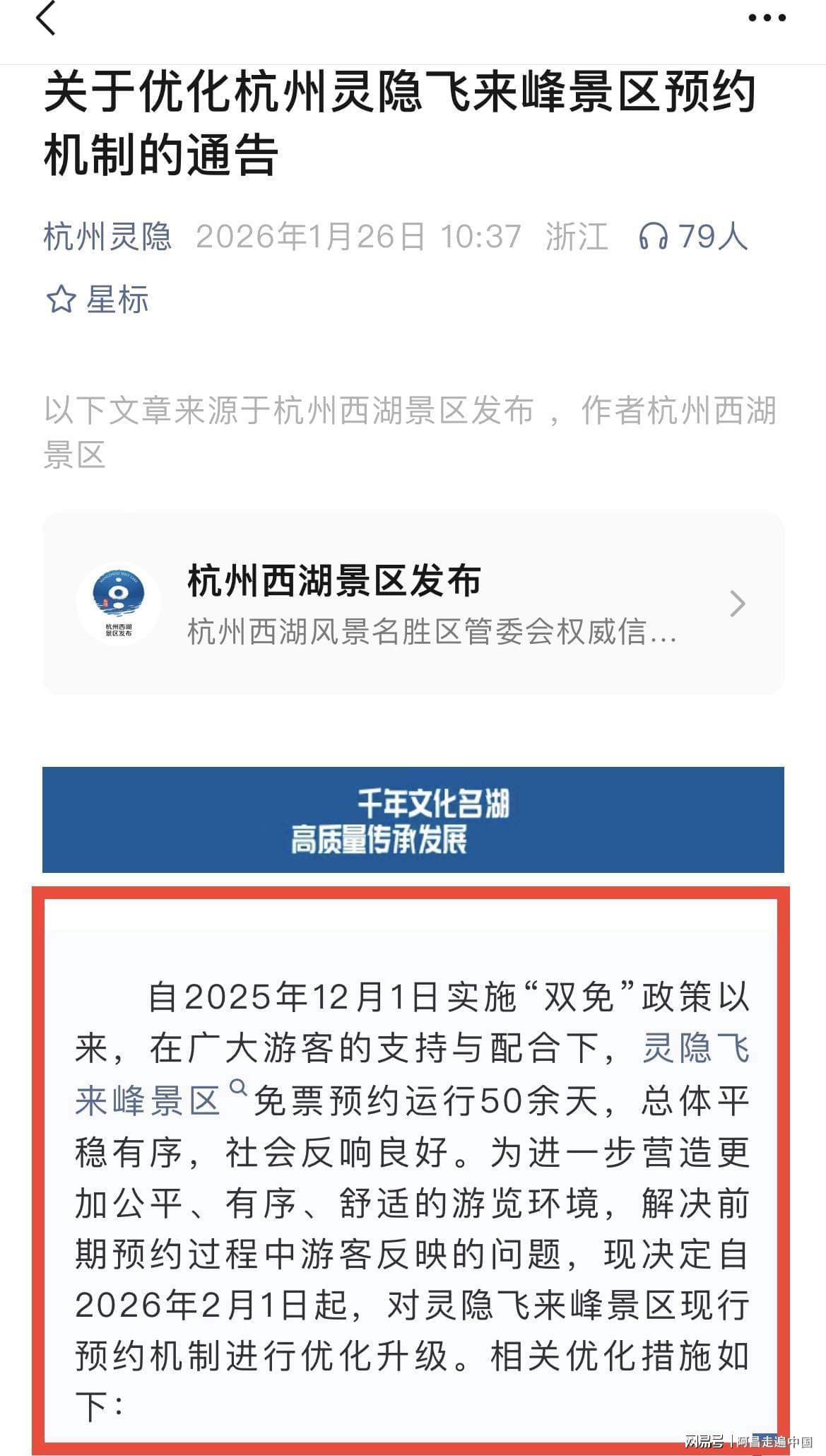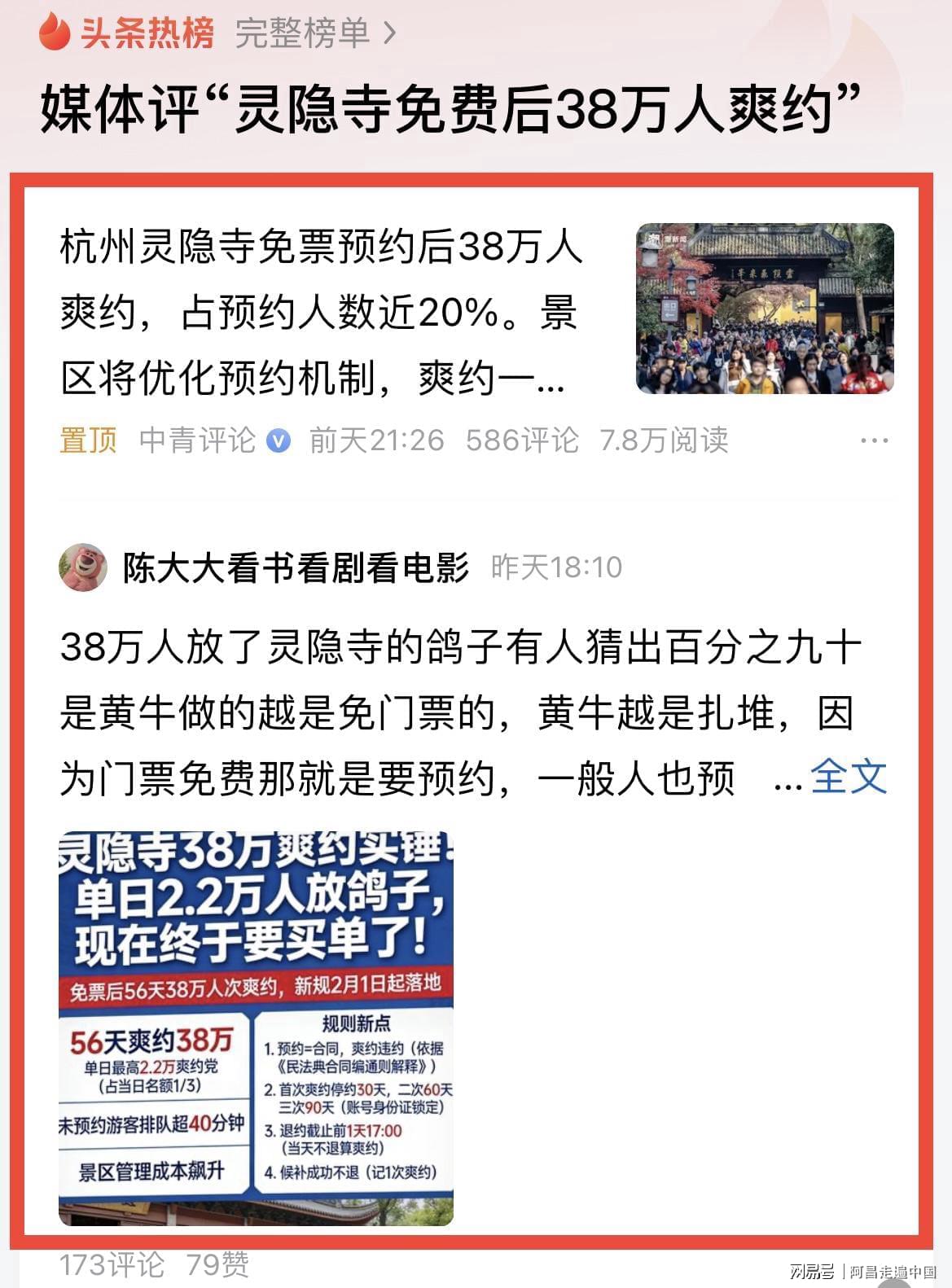 从2025年12月1日起到2026你一月中旬灵隐寺免门票一个多月以来,目前也出了一些问题,然后灵隐寺在免费开放同时,通过实名制预约,是为了控制每日游客接待量,然而一些游客预约上了爽约,导致灵隐寺管理游客数量上出现问题,没预约的线下游客进不去,预约的游客一部分爽约,根据灵隐寺景区官方发布数据看,免门票以来,预约成功的游客有38万人爽约,单日最高爽约达到2.2万人次、超过景区当日承载限额的三分之一。每五人中就有一人“放鸽子” ,表面看是行程变动或遗忘,实则暴露出一种普遍心态:反正不花钱,约了不去也没代价,免门票游客不能没有诚信,爽约让景区寒心。