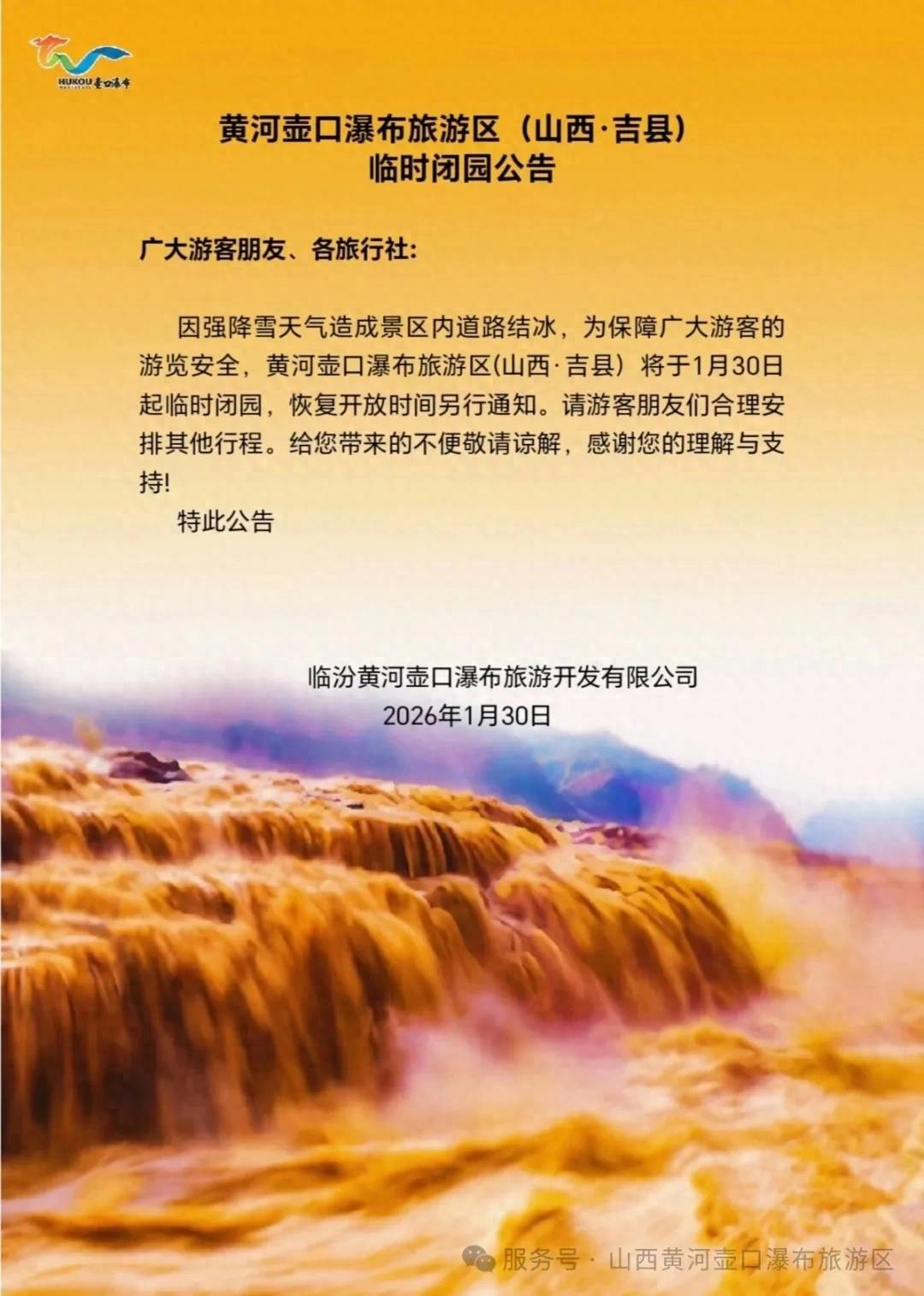 黄河壶口瀑布旅游区(山西•吉县)临时闭园公告