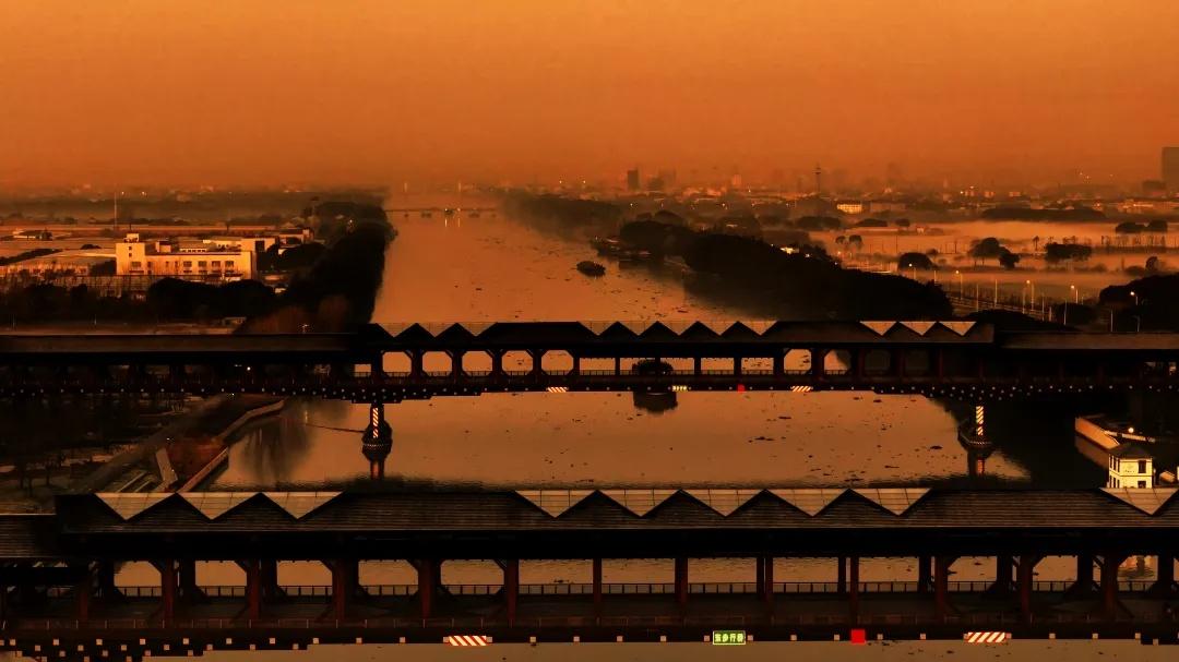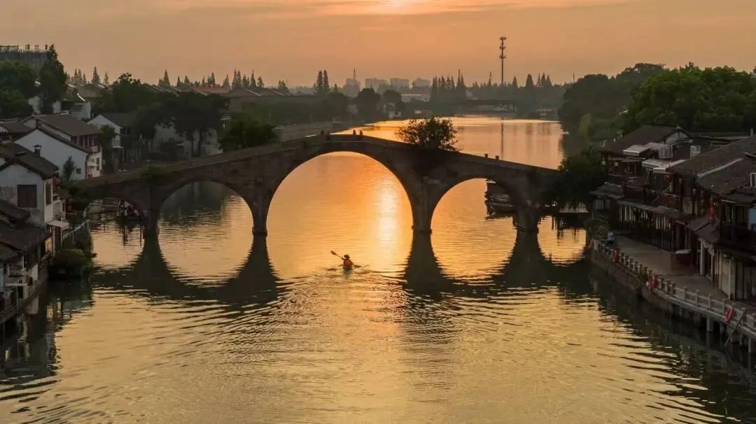 朝阳均匀铺洒在桥身,让斑驳的石拱焕发出历久弥新的光彩,耳边仿佛传来岁时的欢歌。桥下的河水如镜面般平整,将古桥、霞光与两岸白墙黛瓦的民宅完整倒映,偶尔有摇橹船划过,漾起的涟漪打碎倒影,又很快织就新的画面。
