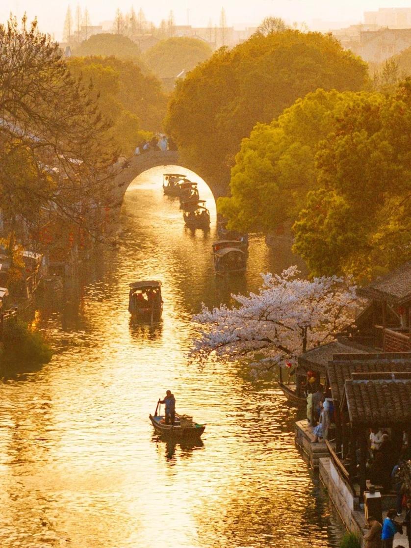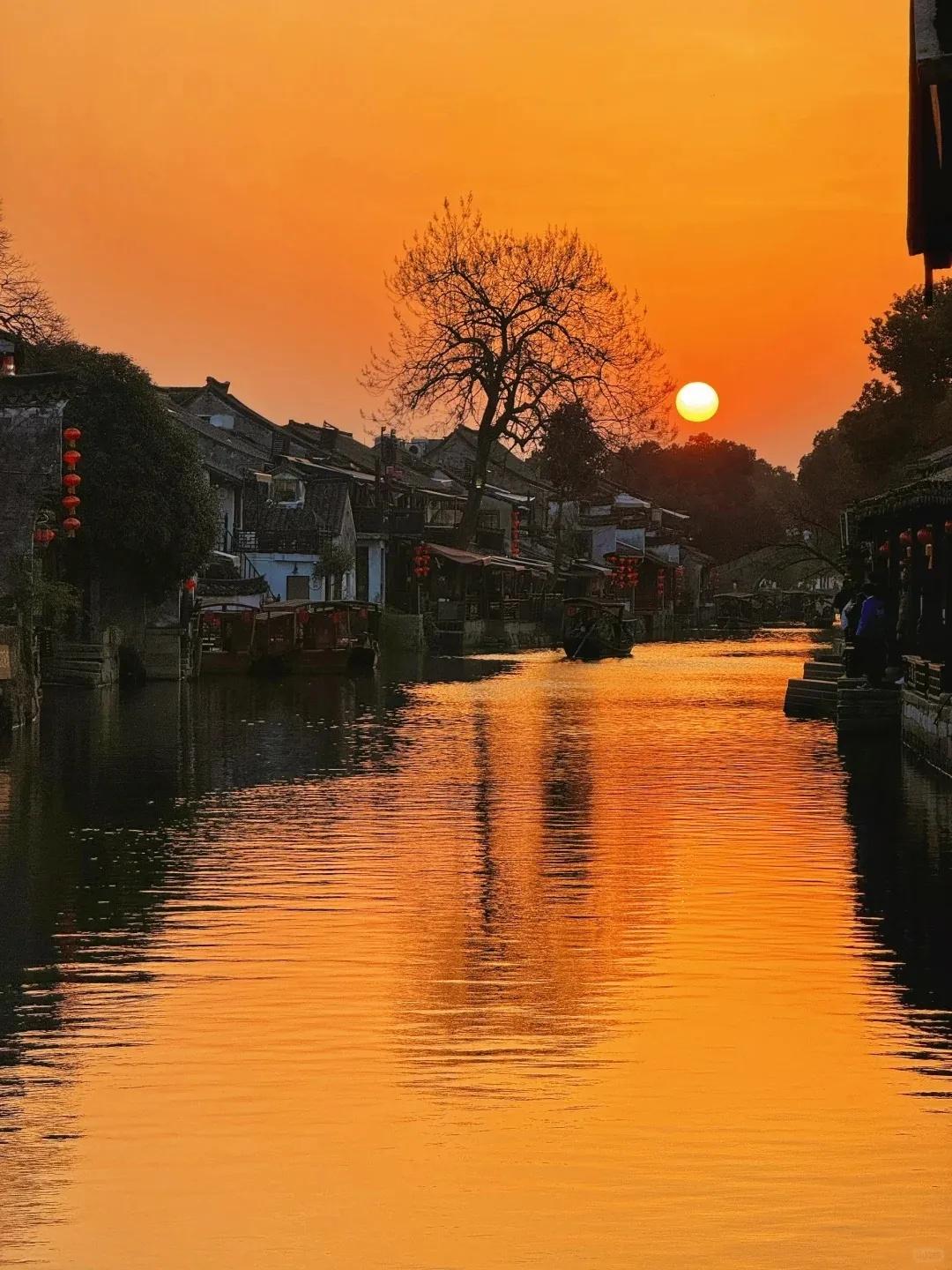 西塘古镇的河道和拱桥正对着日落方向,夕阳时分,粼粼波光里日落融进梦幻江南。当太阳将落未落时,摇橹船缓缓前行,别有一番意趣。