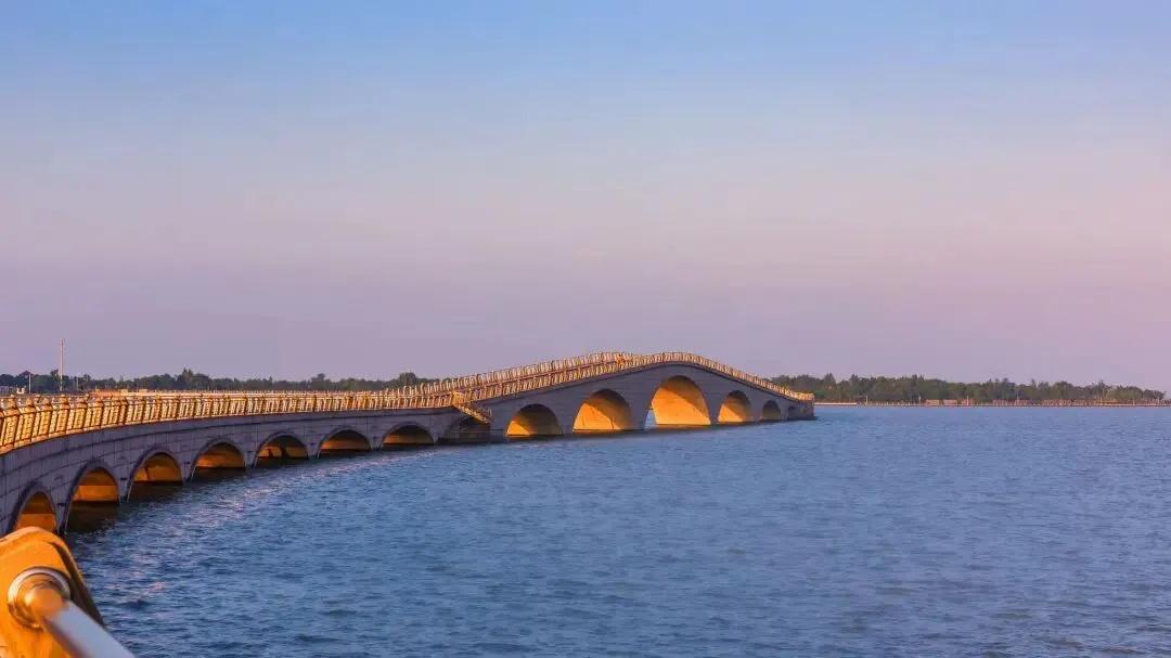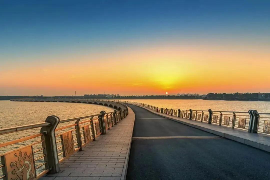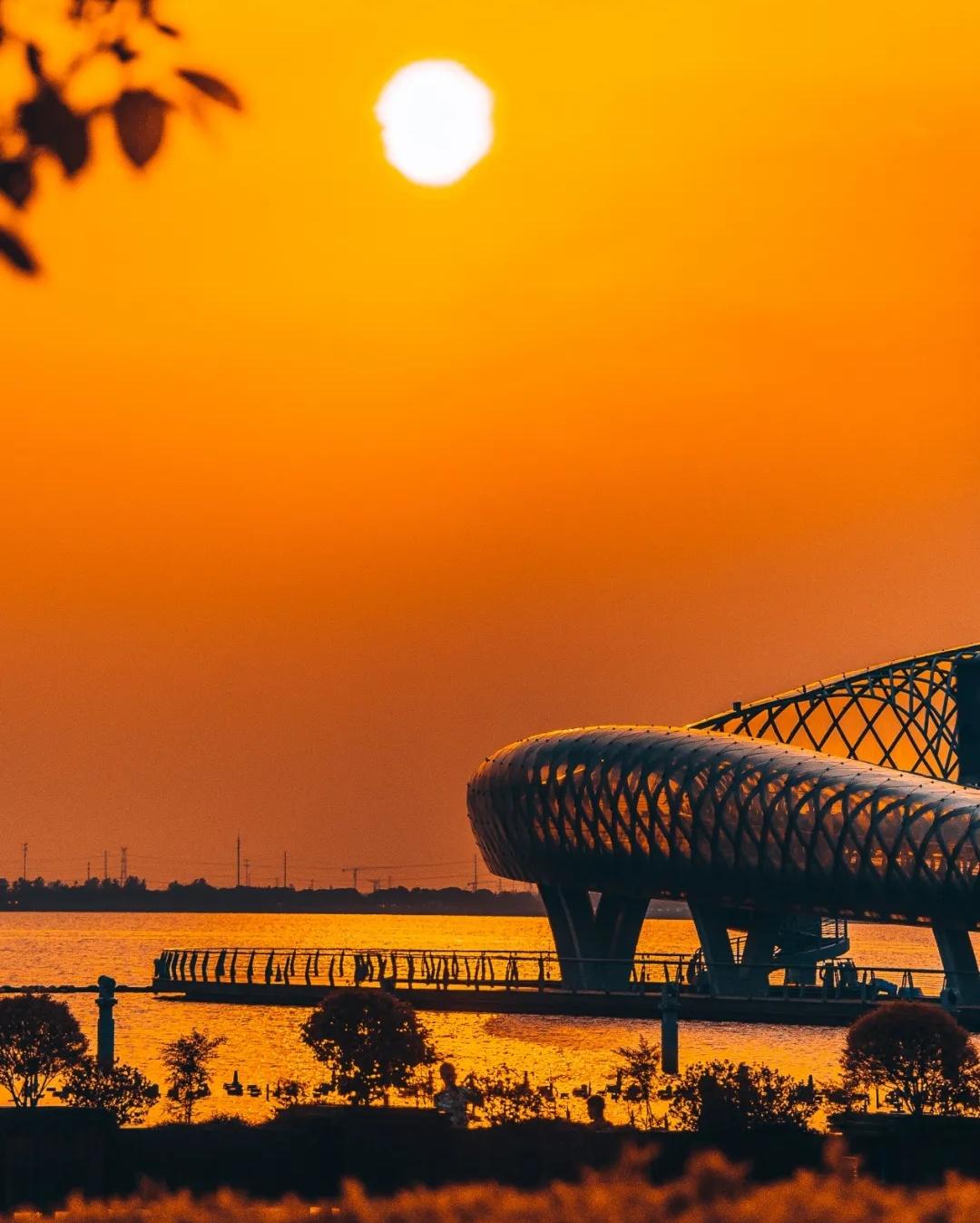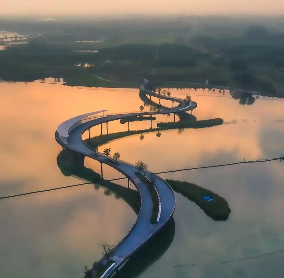 元荡桥上,便是观赏这场盛景的绝佳位置——站在桥上凭栏远眺,晨光漫过桥身,将栏杆与步道染上暖融融的色泽;桥下湖水荡漾,霞光与涟漪交织,分不清是天照亮了水,还是水映红了天。