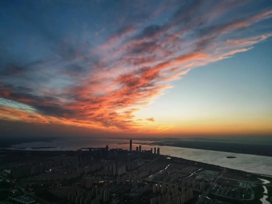 绚丽的晚霞从天际线向四周晕染,从橘红到粉紫,从鎏金到浅蓝,仿佛有人打翻了天宫的调色盘;城市的剪影在霞光中若隐若现,高楼的轮廓被镀上柔和的金边,随手按下快门,每一帧都是无需修饰的大片。