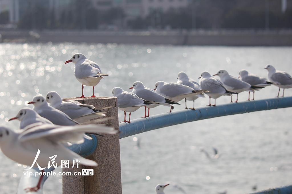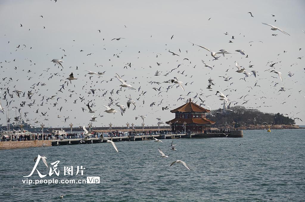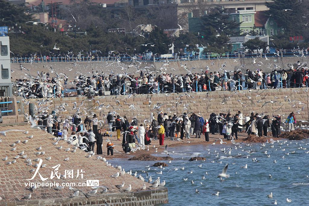 2026年1月30日,山东青岛栈桥景区,成群的海鸥在空中飞翔盘旋,吸引众多游客前来观赏互动,拍照留影。黄杰显摄(人民图片网)